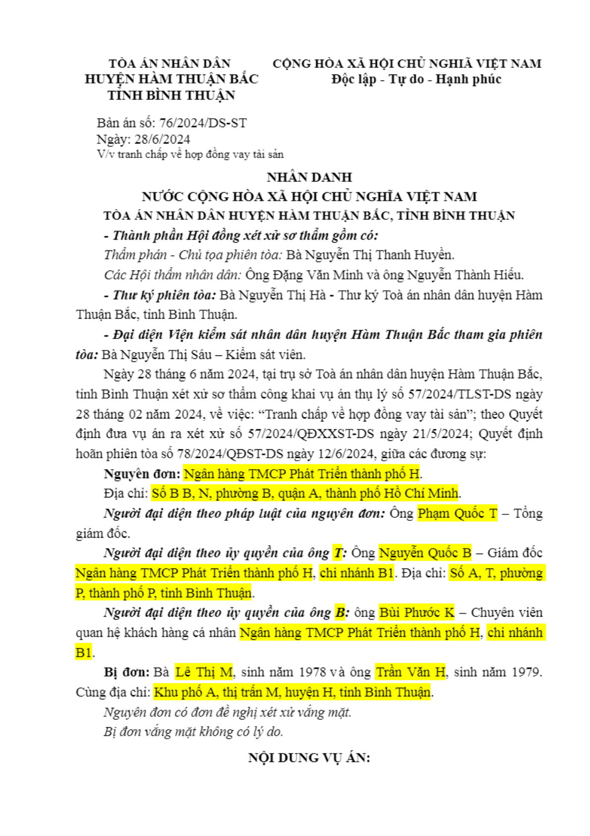 | Tên Bản án: | Bản án số 76/2024/DS-ST ngày 30/09/2024 của TAND huyện Hàm Thuận Bắc, tỉnh Bình Thuận về tranh chấp hợp đồng vay tài sản |