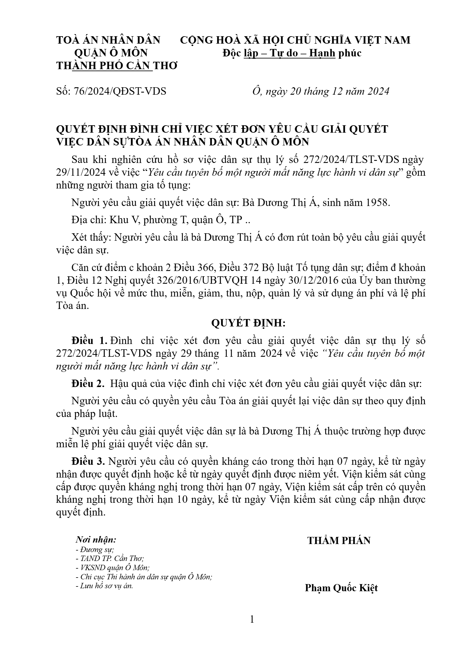 | Tên Bản án: | Bản án số 76/2025/DS-ST ngày 20/12/2025 của TAND Q. Ô Môn, TP. Cần Thơ về y/c tuyên bố hoặc hủy bỏ quyết định tuyên bố một người mất năng lực hành vi dân sự, bị hạn chế năng lực hành vi dân sự hoặc có khó khăn trong nhận thức, làm chủ hành vi |