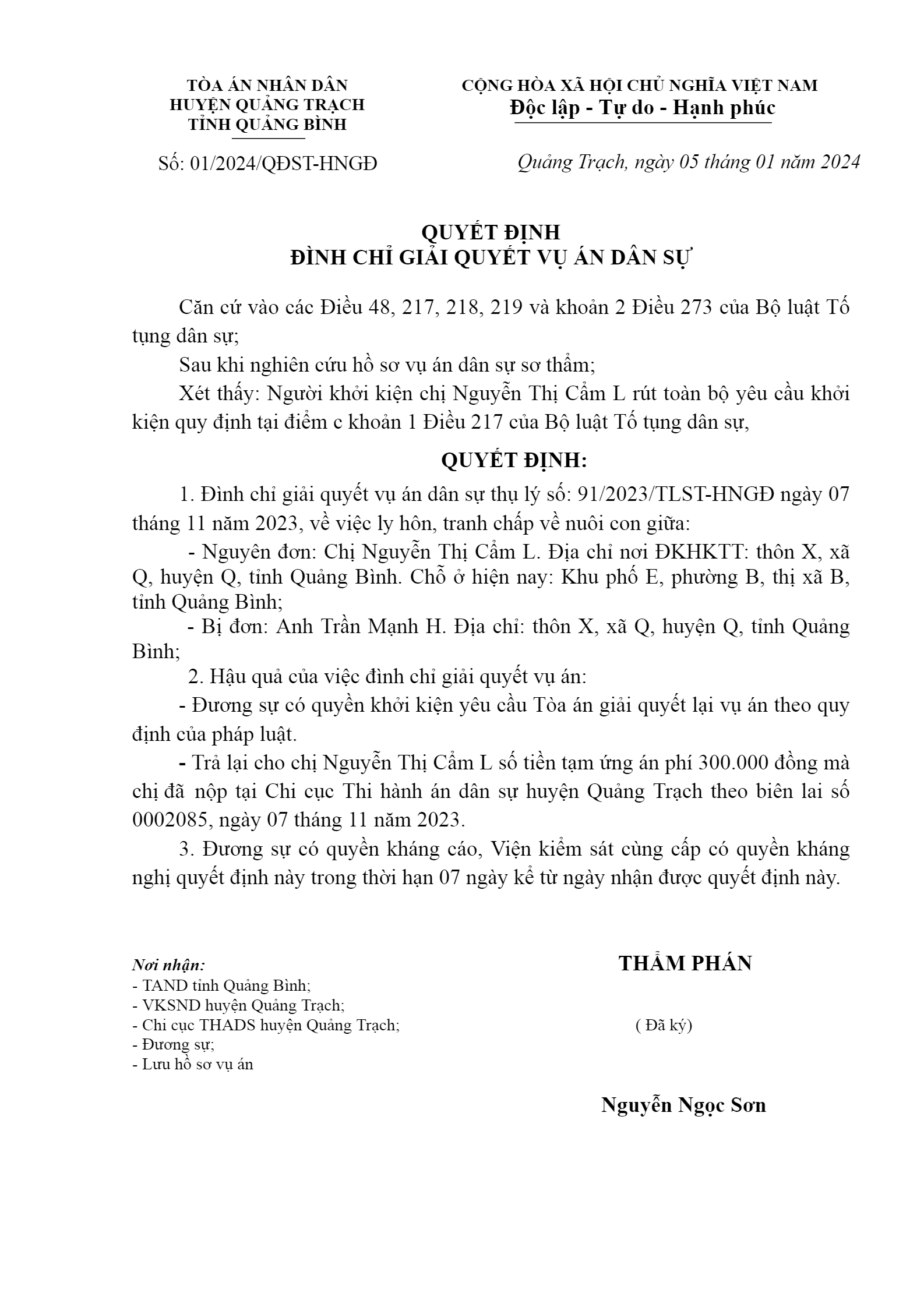Quyết định số 01/2024/QĐST-HNGĐ ngày 05/01/2024 của TAND huyện Quảng Trạch, tỉnh Quảng Bình về vụ án ly hôn về mâu thuẫn gia đình