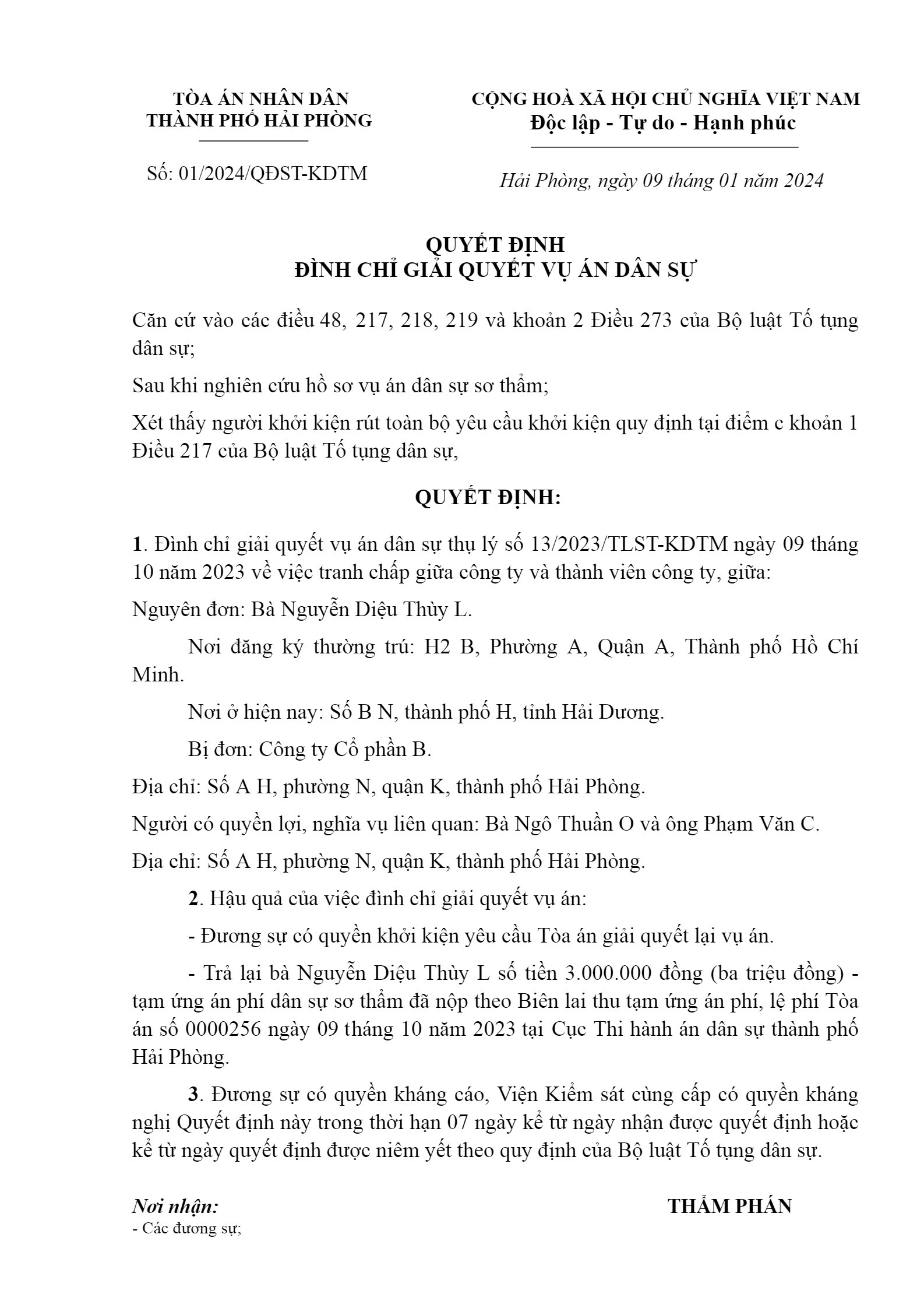 | Tên Quyết định: | Quyết định số 01/2024/QĐST-KDTM ngày 09/01/2024 của TAND TP. Hải Phòng về tranh chấp giữa công ty với các thành viên công ty |