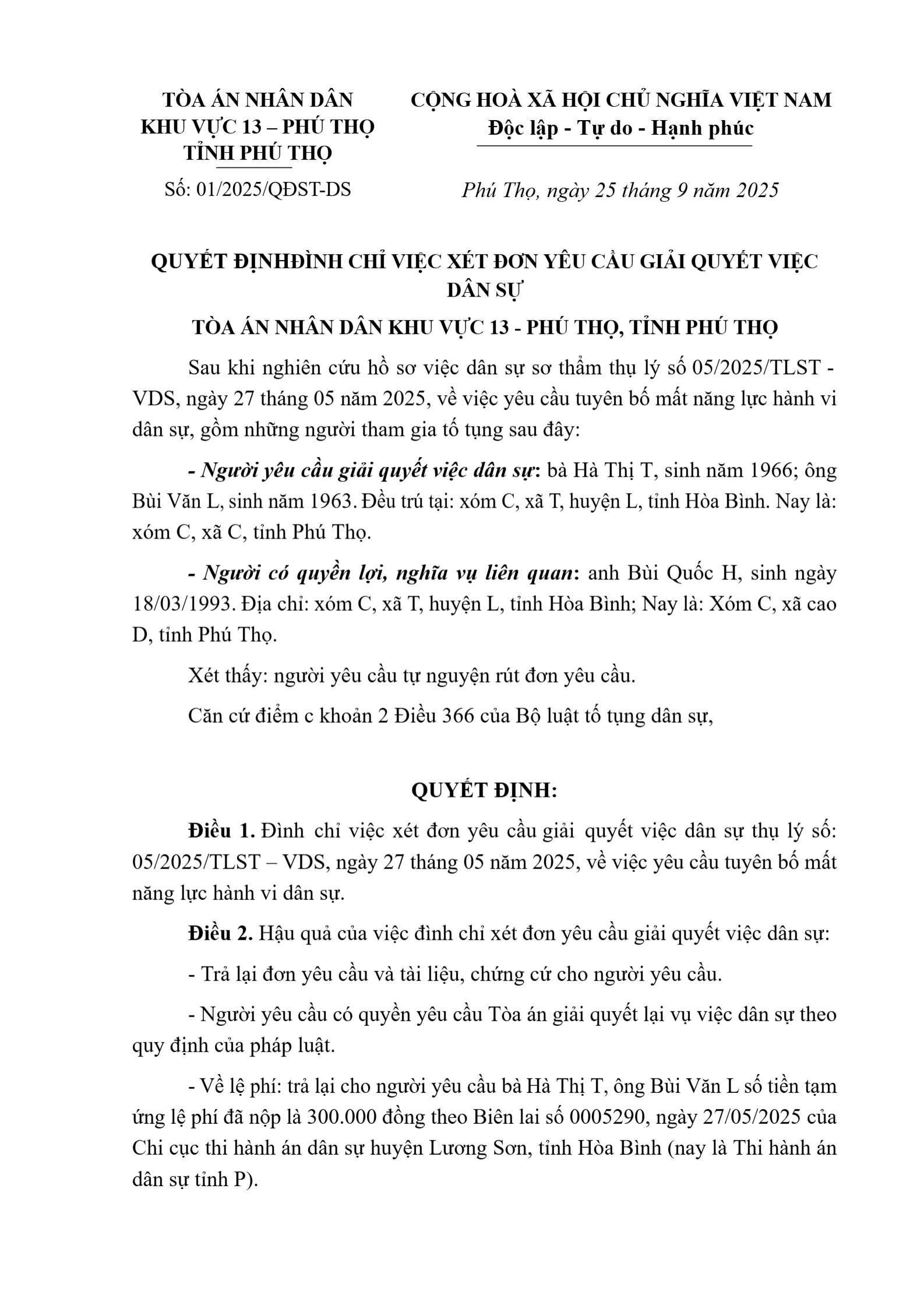 Quyết định số 01/2025/QĐST-DS ngày 25/09/2025 của Tòa án nhân dân khu vực 13 - Phú Thọ, tỉnh Phú Thọ về y/c tuyên bố hoặc hủy bỏ quyết định tuyên bố một người mất năng lực hành vi dân sự, bị hạn chế năng lực hành vi dân sự hoặc có khó khăn trong nhận thức, làm chủ hành vi