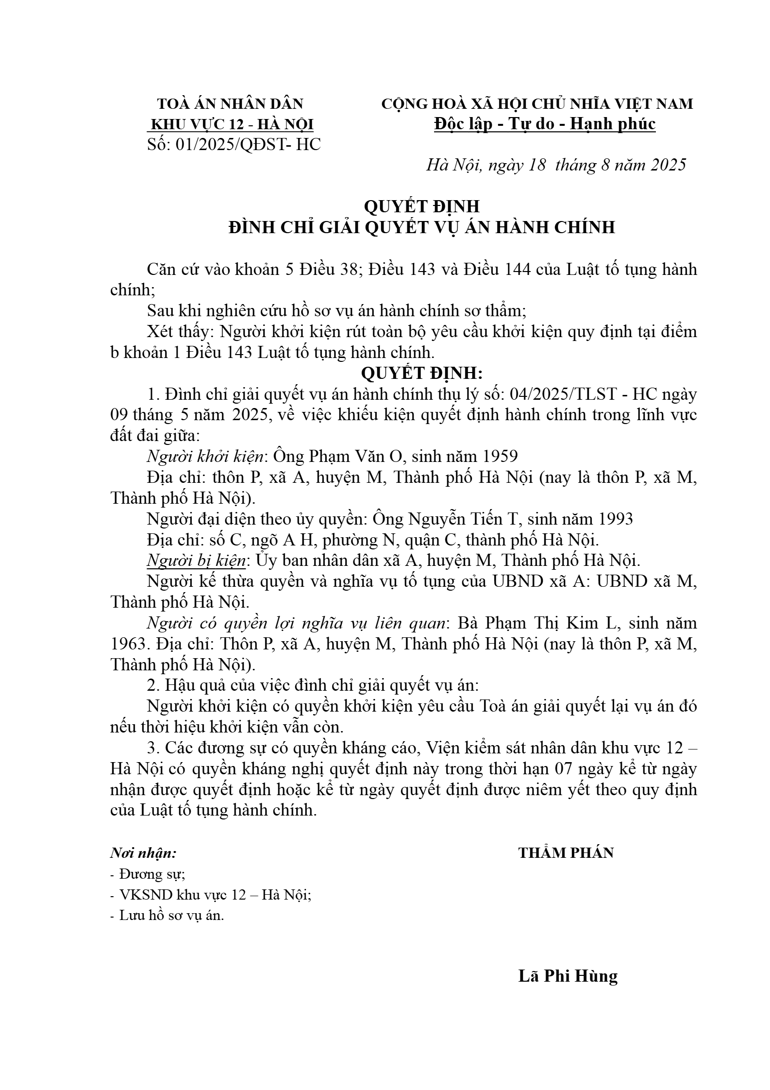 Quyết định số 01/2025/QĐST-HC ngày 18/08/2025 của Tòa án nhân dân khu vực 12 - Hà Nội, TP. Hà Nội