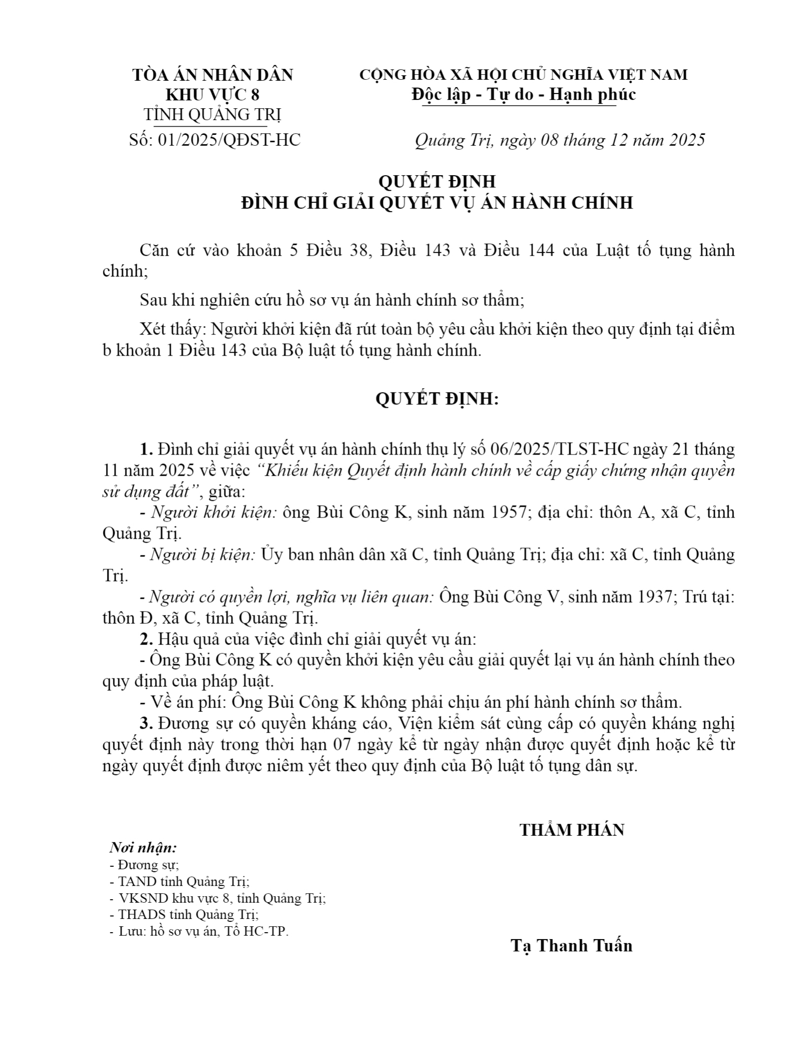 Quyết định số 01/2025/QĐST-HC ngày 08/12/2025 của Tòa án nhân dân khu vực 8 - Quảng Trị, tỉnh Quảng Trị