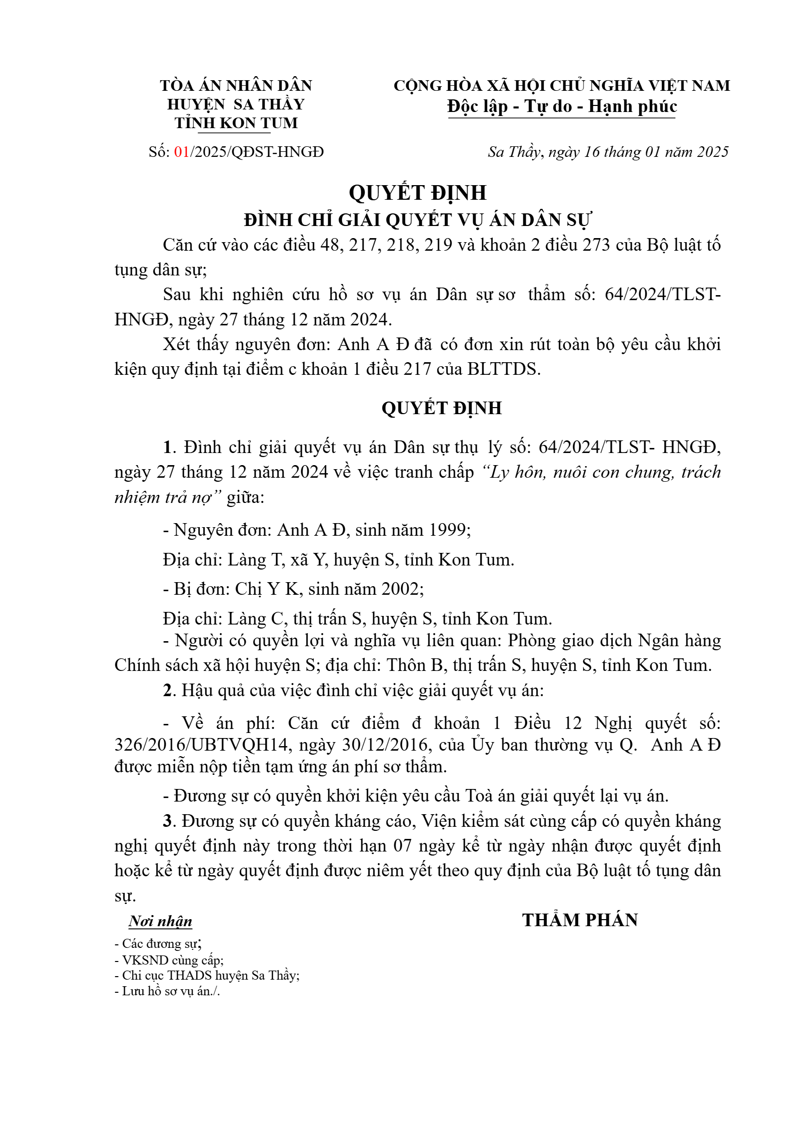 Quyết định số 01/2025/QĐST-HNGĐ ngày 16/01/2025 của TAND huyện Sa Thầy, tỉnh Kon Tum về vụ án ly hôn về mâu thuẫn gia đình
