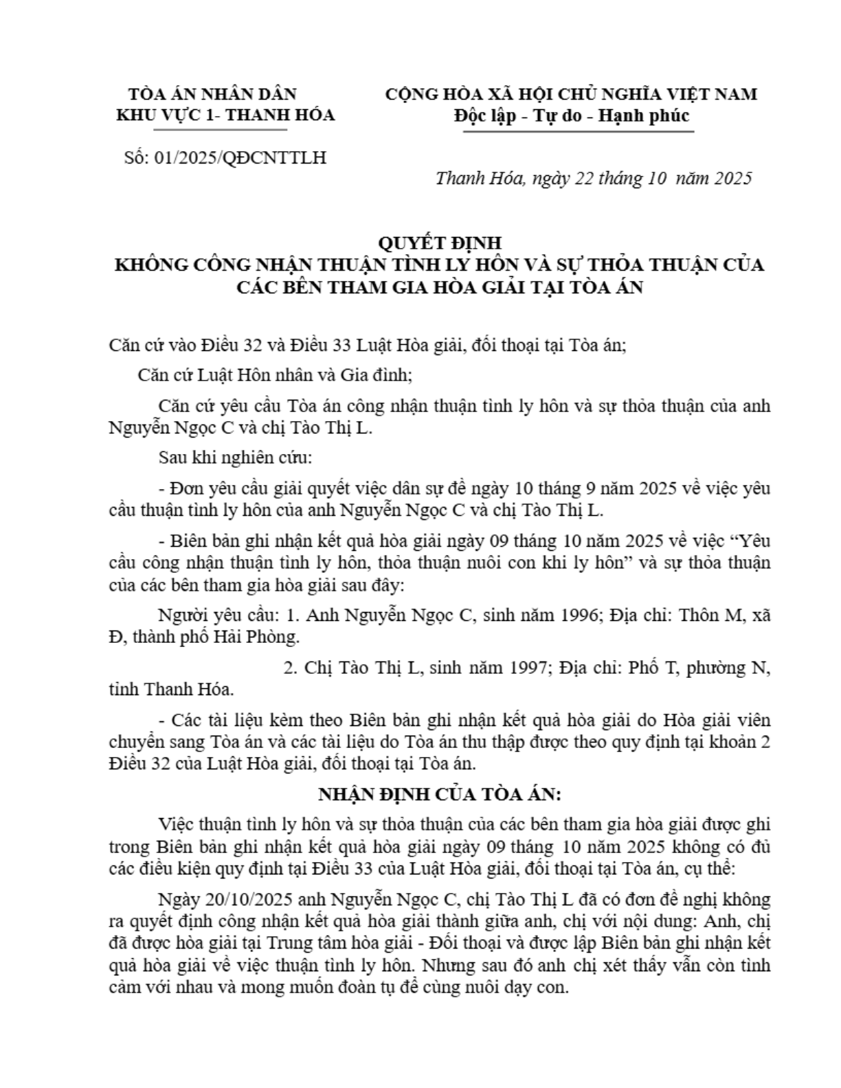 | Tên Quyết định: | Quyết định số 01/2025/QĐST-HNGĐ ngày 22/10/2025 của Tòa án nhân dân khu vực 1 - Thanh Hóa, tỉnh Thanh Hóa về yêu cầu công nhận thuận tình ly hôn |