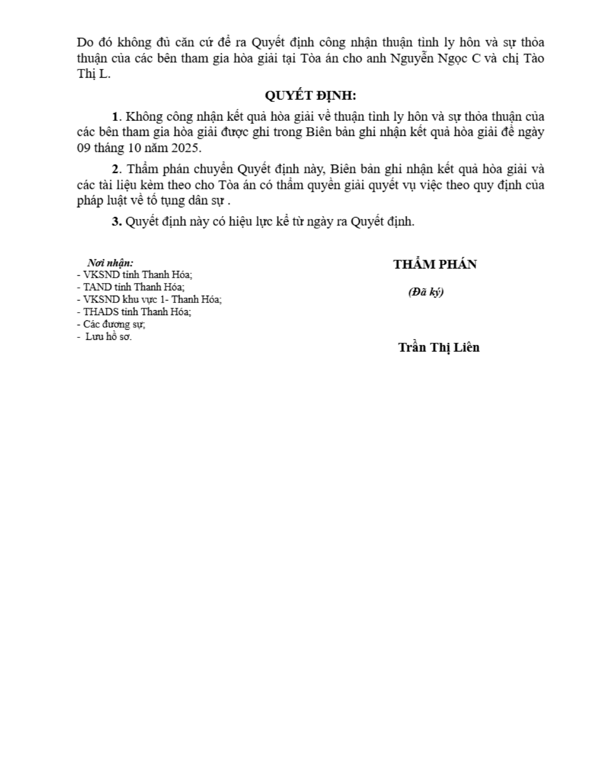 Quyết định số 01/2025/QĐST-HNGĐ ngày 22/10/2025 của Tòa án nhân dân khu vực 1 - Thanh Hóa, tỉnh Thanh Hóa về yêu cầu công nhận thuận tình ly hôn