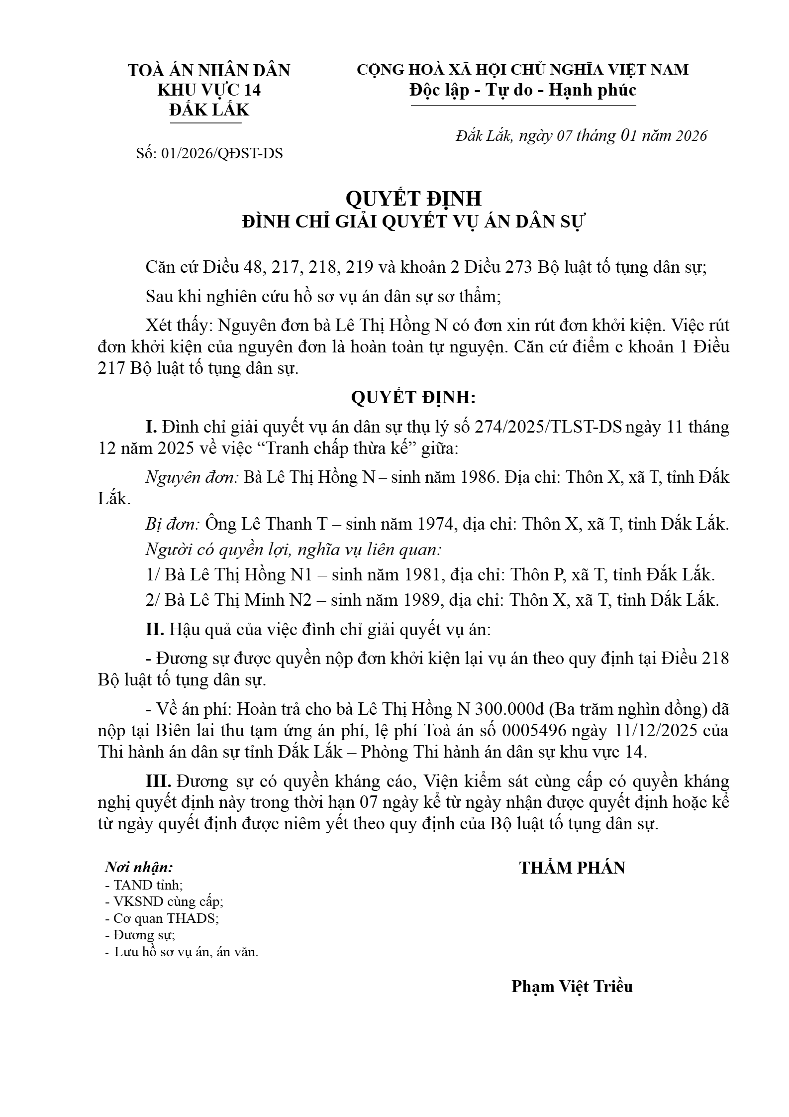 Quyết định số 01/2026/QĐST-DS ngày 07/01/2026 của Tòa án nhân dân khu vực 14 - Đắk Lắk, tỉnh Đắk Lắk về tranh chấp về thừa kế tài sản