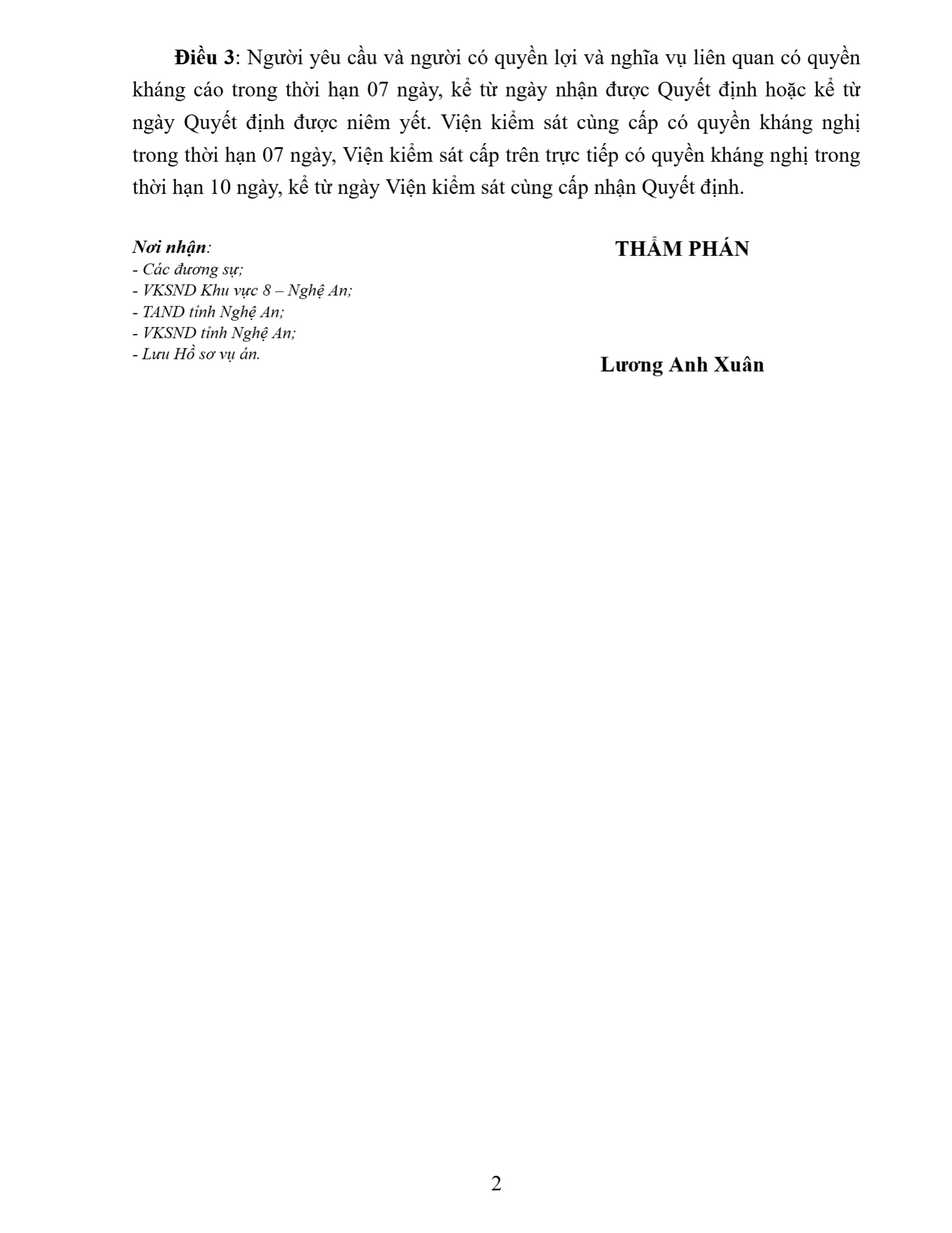 | Tòa án xét xử: | Tòa án nhân dân khu vực 8 - Nghệ An, tỉnh Nghệ An |