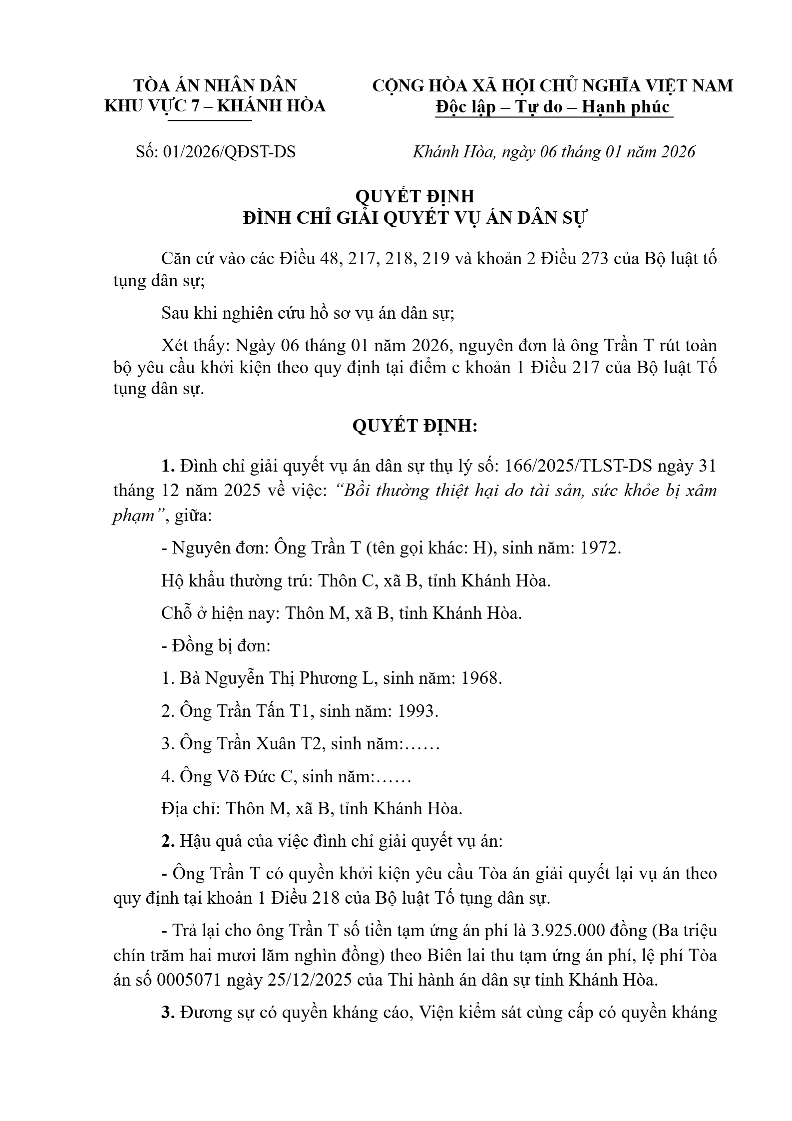 | Thông tin về vụ/việc: | Đình chỉ Bồi thường thiệt hại do tài sản, sức khỏe bị xâm phạm giữa ông Trần T và bà Nguyễn Thị Phương L |