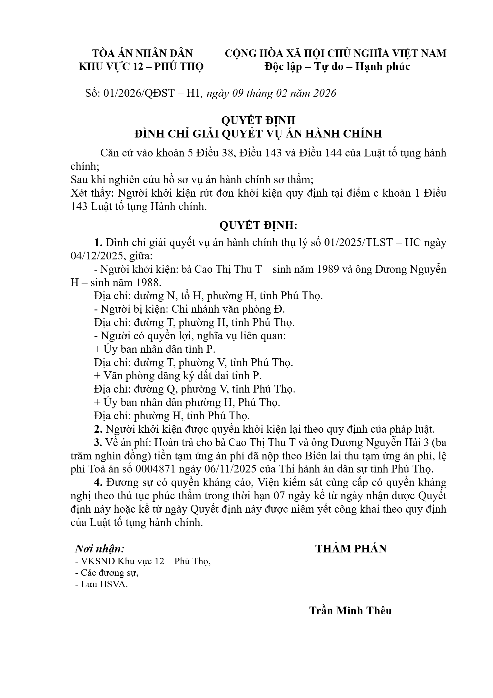 Quyết định số 01/2026/QĐST-HC ngày 09/02/2026 của Tòa án nhân dân khu vực 12 - Phú Thọ, tỉnh Phú Thọ