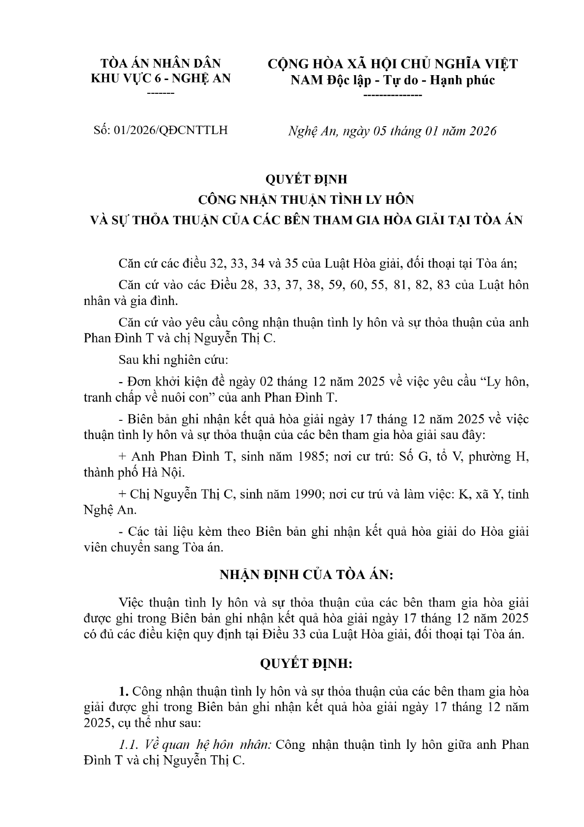 Quyết định số 01/2026/QĐST-HNGĐ ngày 05/01/2026 của Tòa án nhân dân khu vực 6 - Nghệ An, tỉnh Nghệ An về vụ án ly hôn về mâu thuẫn gia đình