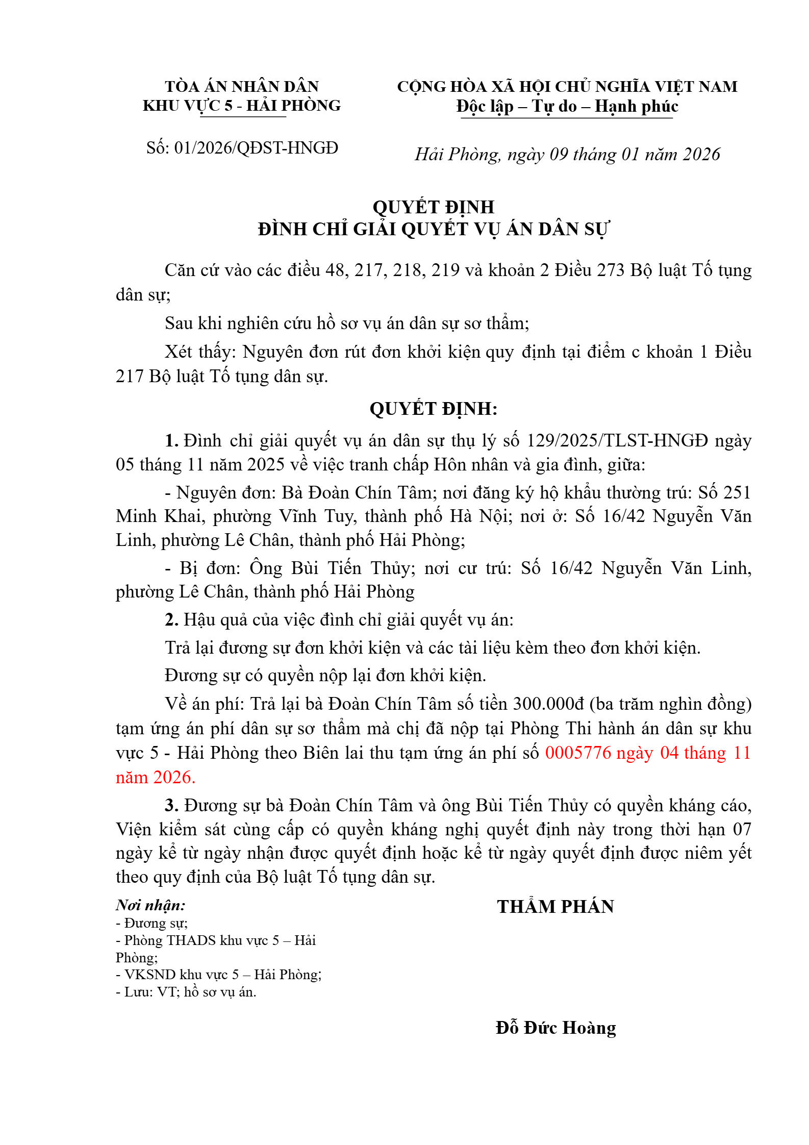 Quyết định số 01/2026/QĐST-HNGĐ ngày 09/01/2026 của Tòa án nhân dân khu vực 5 - Hải Phòng, TP. Hải Phòng về vụ án ly hôn về mâu thuẫn gia đình