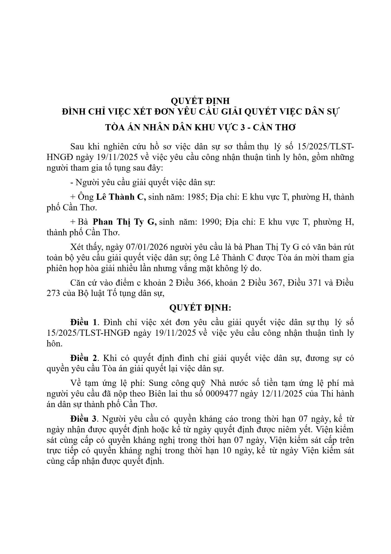 | Tòa án xét xử: | Tòa án nhân dân khu vực 3 - Cần Thơ, TP. Cần Thơ |