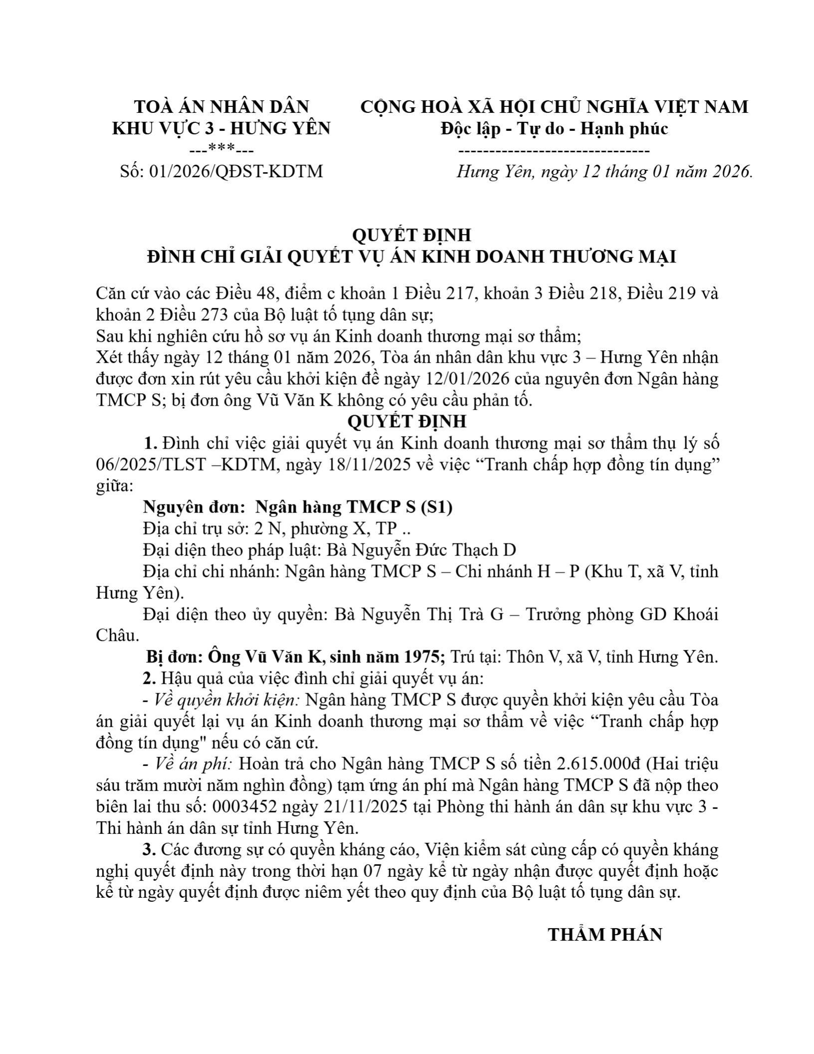 | Số hiệu: | 01/2026/QĐST-KDTM |