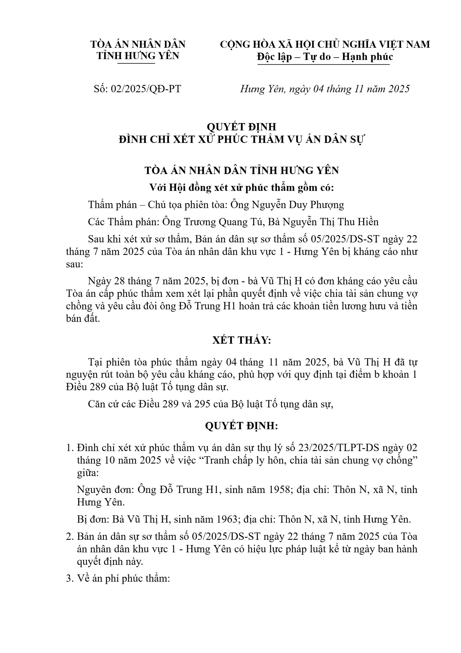| Tên Quyết định: | Quyết định số 02/2025 ngày 04/11/2025 của TAND tỉnh Hưng Yên về tranh chấp về chia tài sản khi ly hôn |