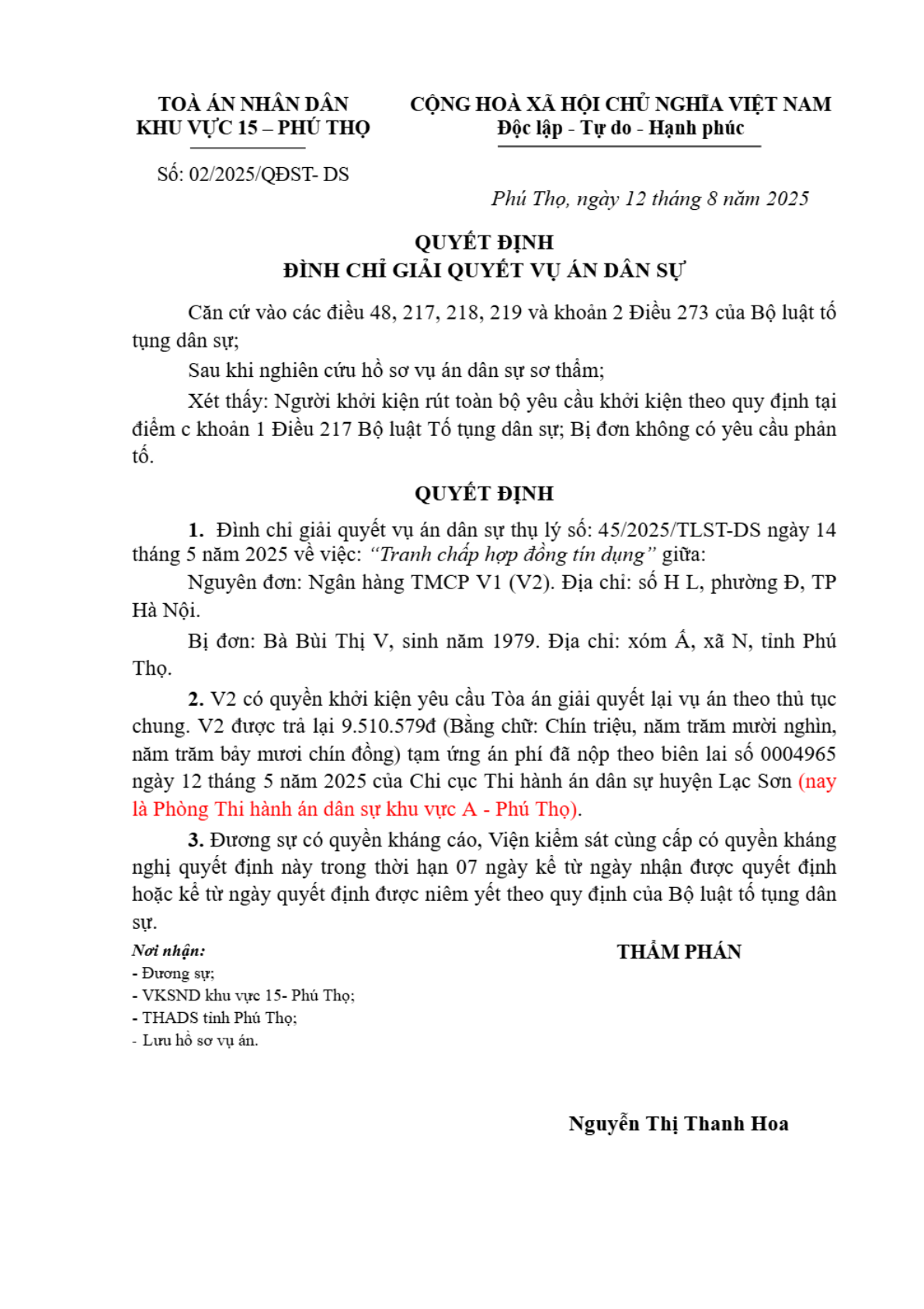 Quyết định số 02/2025/QĐST- ngày 30/09/2025 của Tòa án nhân dân khu vực 15 - Phú Thọ, tỉnh Phú Thọ về tranh chấp hợp đồng tín dụng