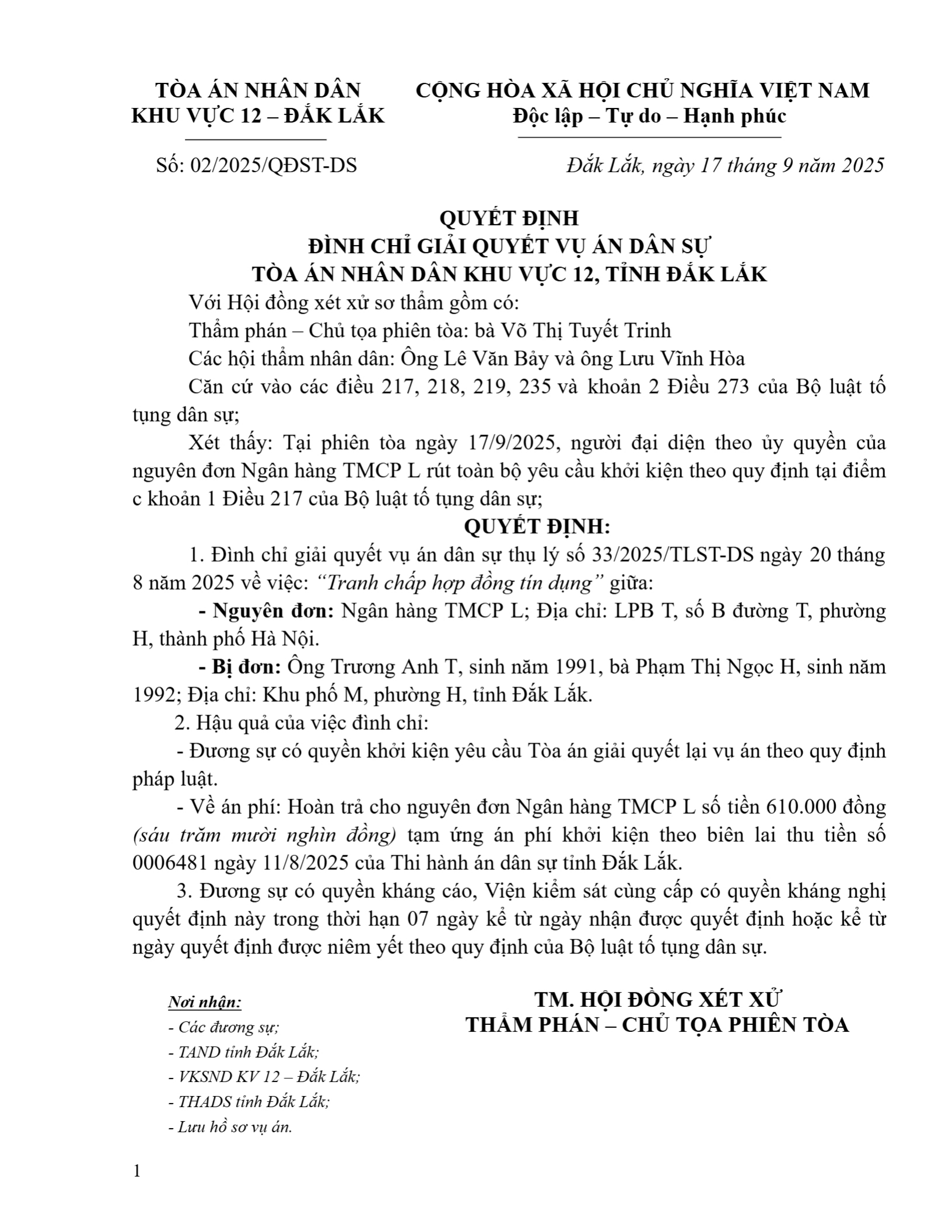| Thông tin về vụ/việc: | ĐÌNH CHỈ TẠI TÒA |