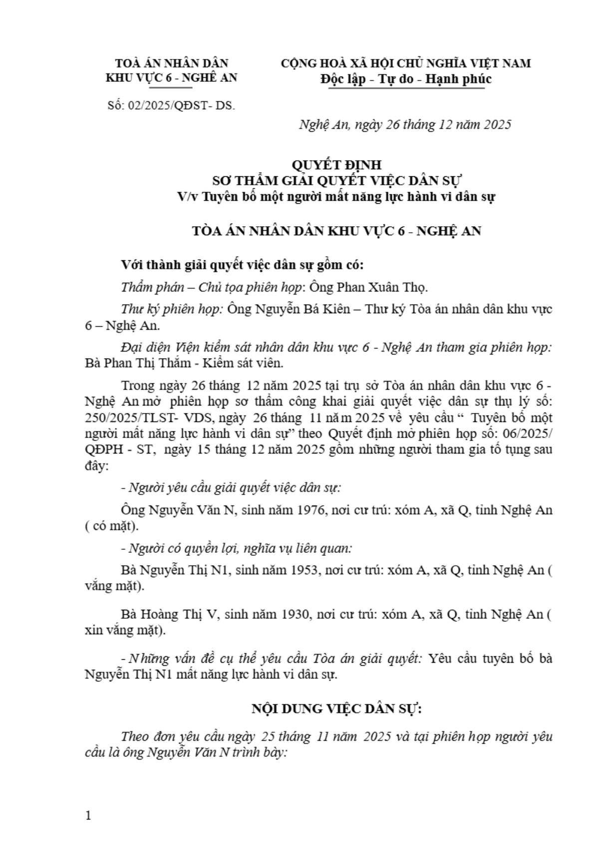 Quyết định số 02/2025/QĐST-DS ngày 26/12/2025 của Tòa án nhân dân khu vực 6 - Nghệ An, tỉnh Nghệ An về y/c tuyên bố hoặc hủy bỏ quyết định tuyên bố một người mất năng lực hành vi dân sự, bị hạn chế năng lực hành vi dân sự hoặc có khó khăn trong nhận thức, làm chủ hành vi