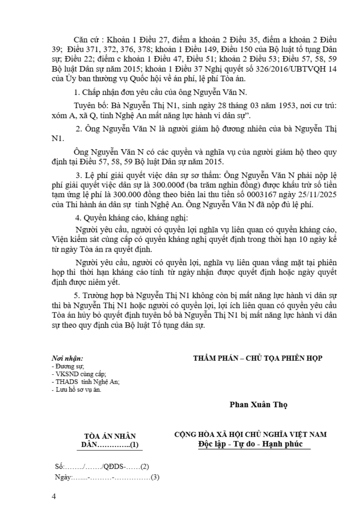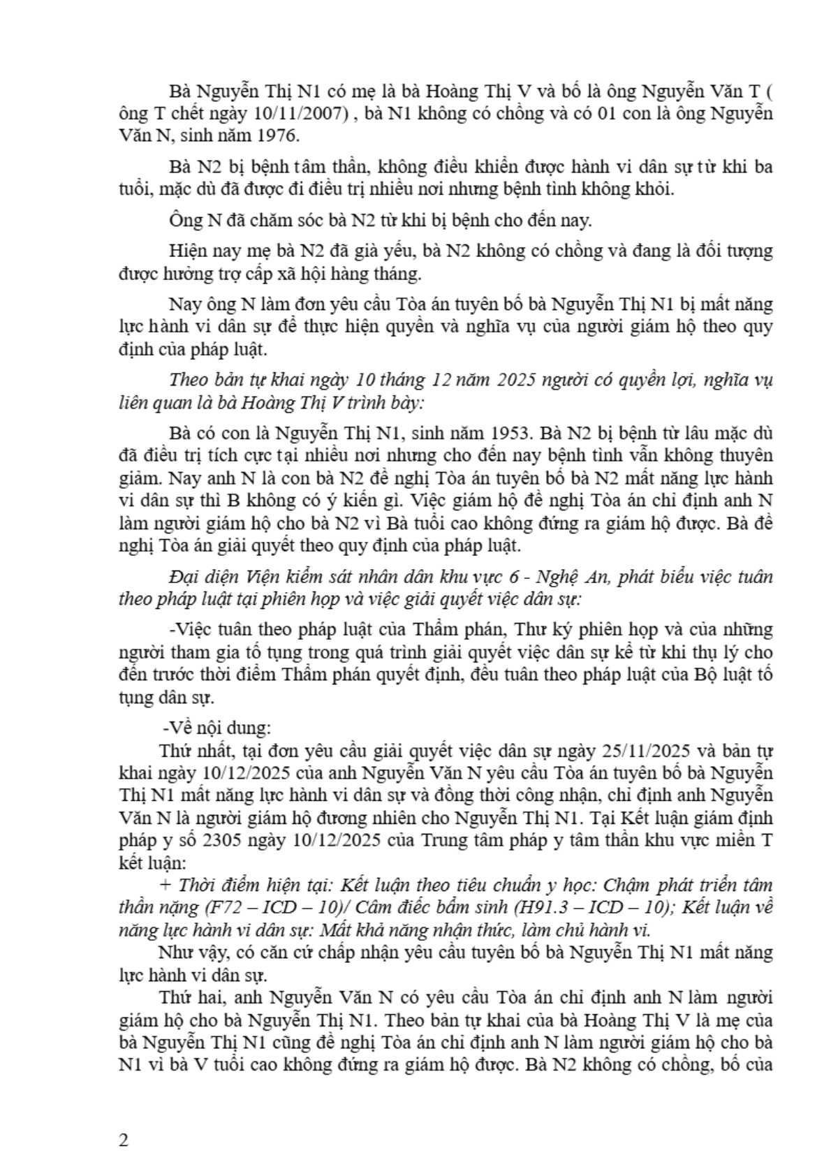 | Tên Quyết định: | Quyết định số 02/2025/QĐST-DS ngày 26/12/2025 của Tòa án nhân dân khu vực 6 - Nghệ An, tỉnh Nghệ An về y/c tuyên bố hoặc hủy bỏ quyết định tuyên bố một người mất năng lực hành vi dân sự, bị hạn chế năng lực hành vi dân sự hoặc có khó khăn trong nhận thức, làm chủ hành vi |