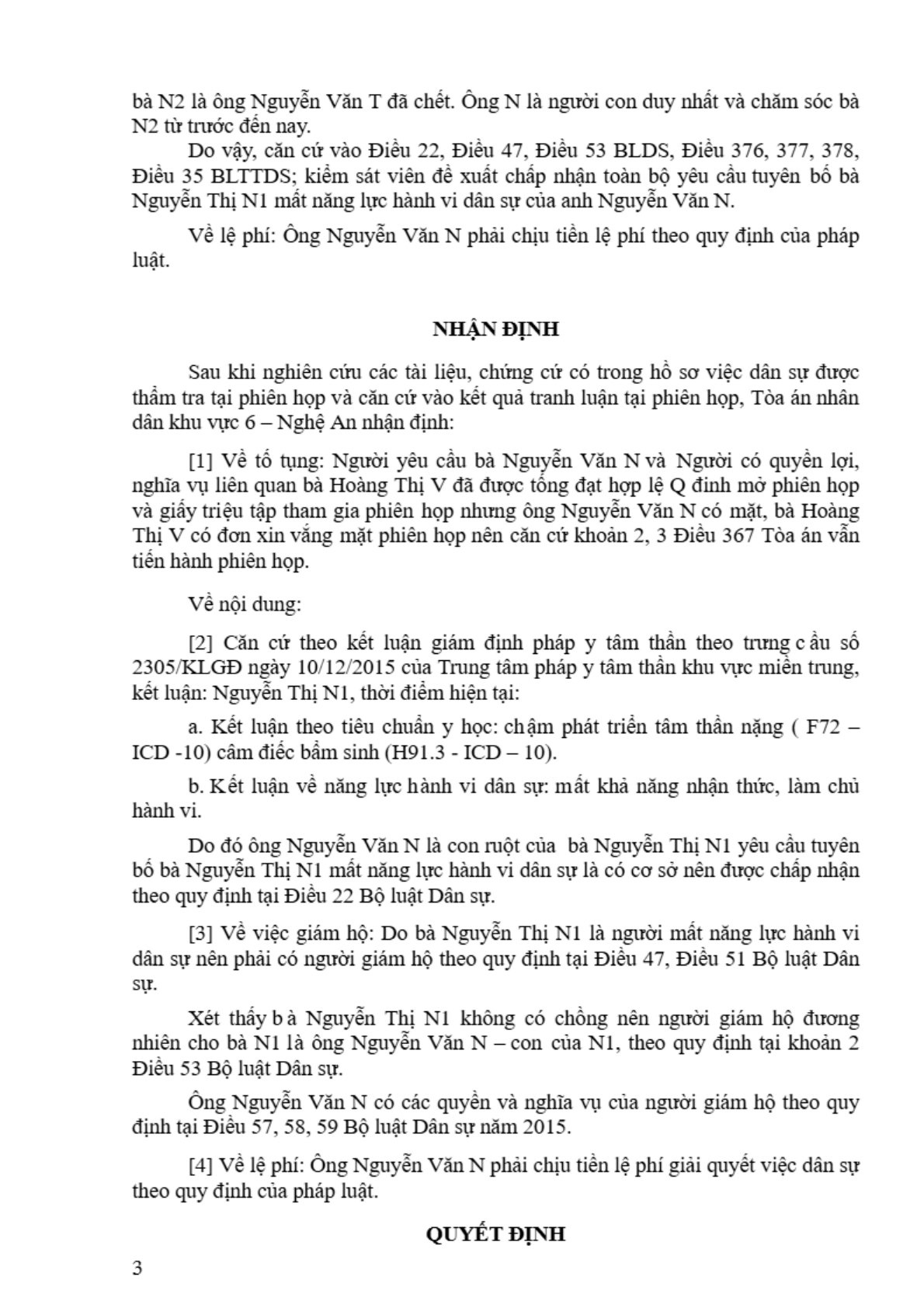 | Quan hệ pháp luật: | Y/c tuyên bố hoặc hủy bỏ quyết định tuyên bố một người mất năng lực hành vi dân sự, bị hạn chế năng lực hành vi dân sự hoặc có khó khăn trong nhận thức, làm chủ hành vi |