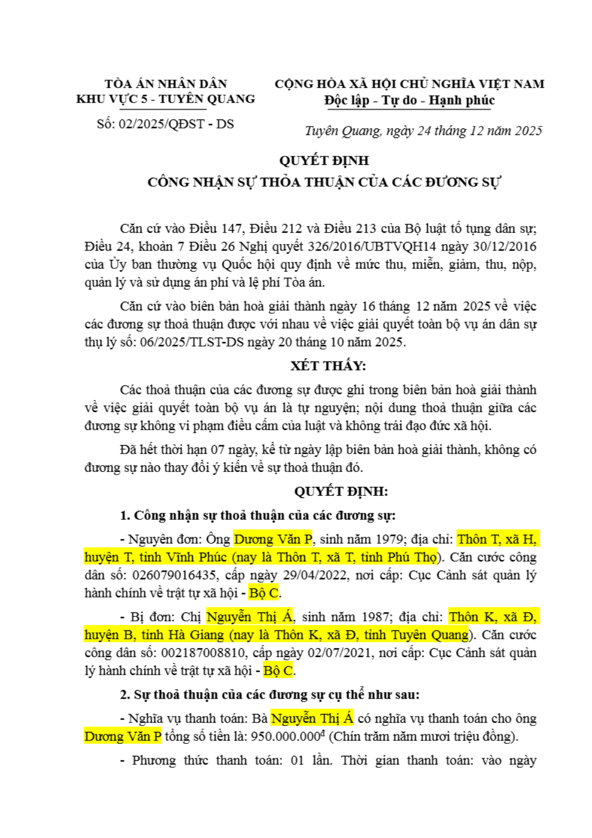 Quyết định số 02/2025/QĐST-DS ngày 24/12/2025 của Tòa án nhân dân khu vực 5 - Tuyên Quang, tỉnh Tuyên Quang về tranh chấp hợp đồng vay tài sản
