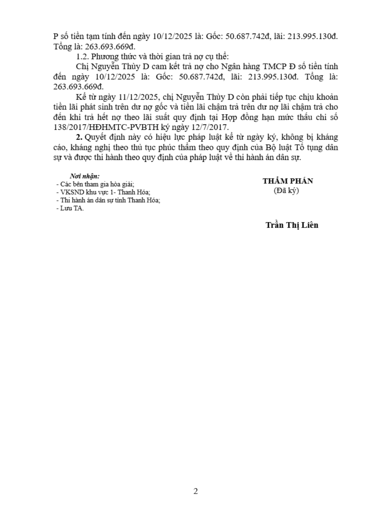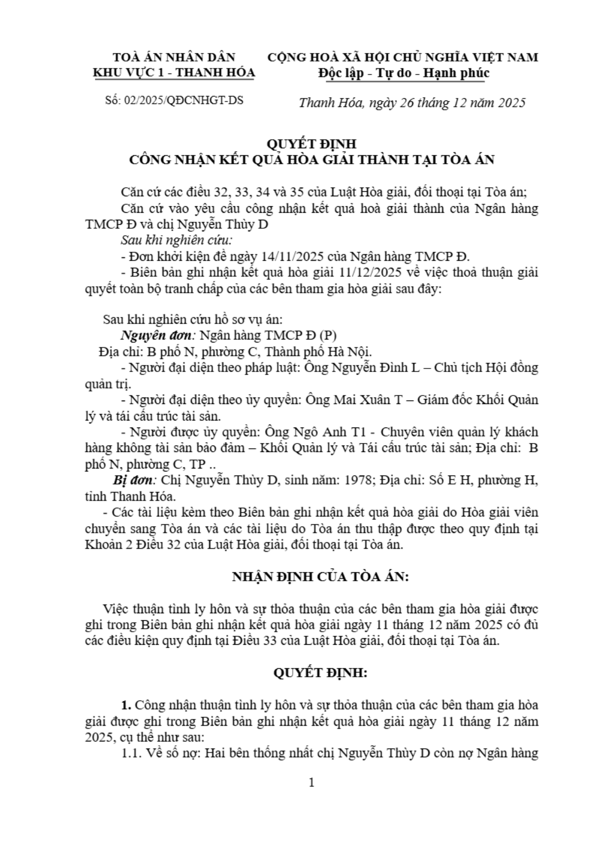 Quyết định số 02/2025/QĐST-DS ngày 26/12/2025 của Tòa án nhân dân khu vực 1 - Thanh Hóa, tỉnh Thanh Hóa về tranh chấp hợp đồng tín dụng