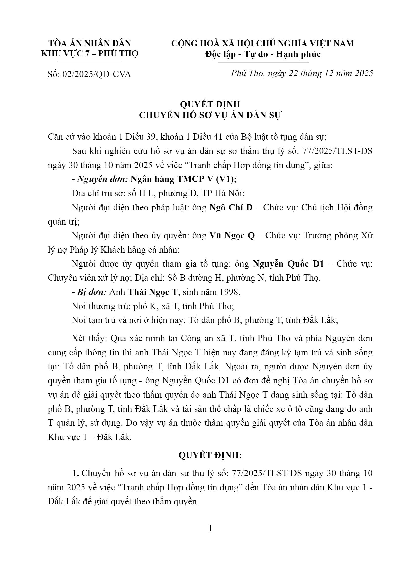| Tên Quyết định: | Quyết định số 02/2025/QĐST-DS ngày 22/12/2025 của Tòa án nhân dân khu vực 7 - Phú Thọ, tỉnh Phú Thọ về tranh chấp hợp đồng tín dụng |