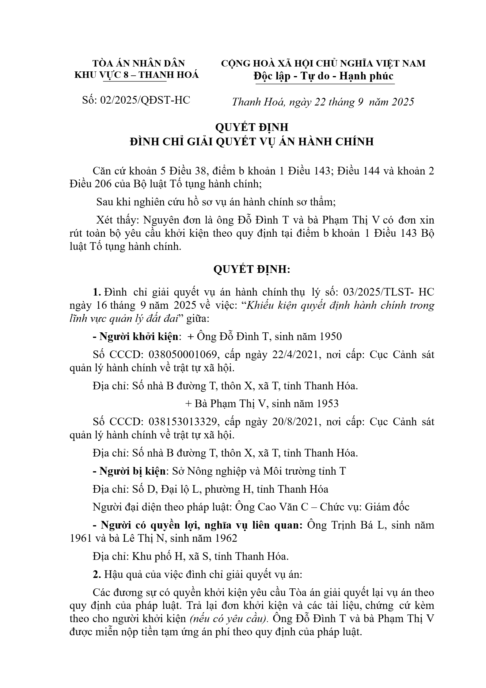 Quyết định số 02/2025/QĐST-HC ngày 22/09/2025 của Tòa án nhân dân khu vực 8 - Thanh Hóa, tỉnh Thanh Hóa