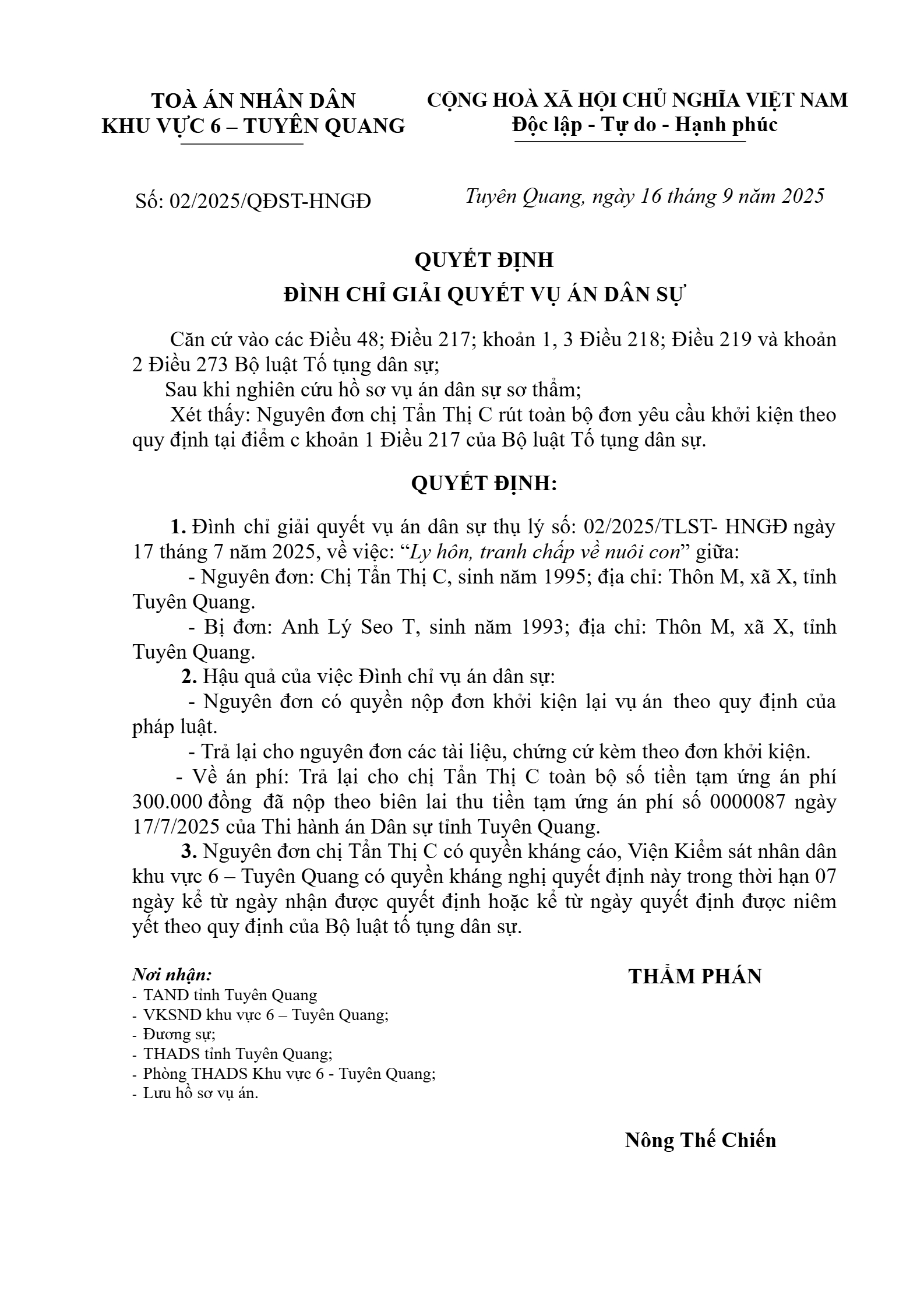 Quyết định số 02/2025/QĐST-HNGĐ ngày 16/09/2025 của Tòa án nhân dân khu vực 6 - Tuyên Quang, tỉnh Tuyên Quang về vụ án ly hôn về mâu thuẫn gia đình