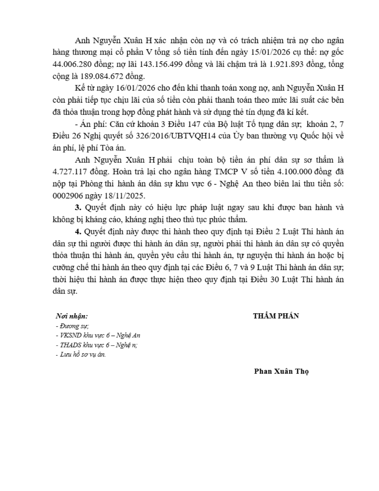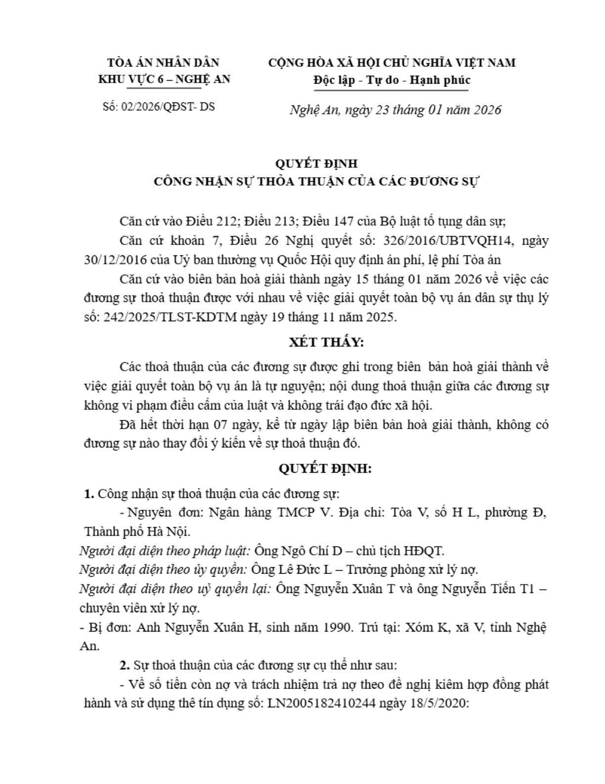 Quyết định số 02/2026/DS-ST ngày 23/01/2026 của Tòa án nhân dân khu vực 6 - Nghệ An, tỉnh Nghệ An về tranh chấp hợp đồng tín dụng