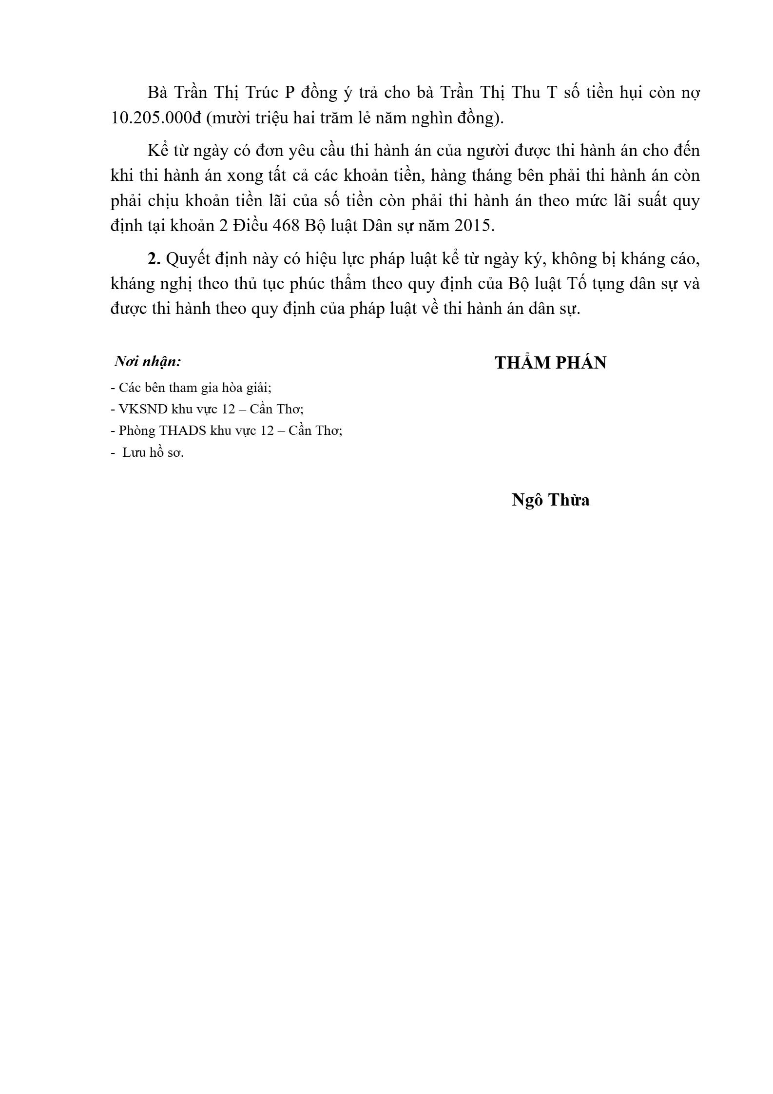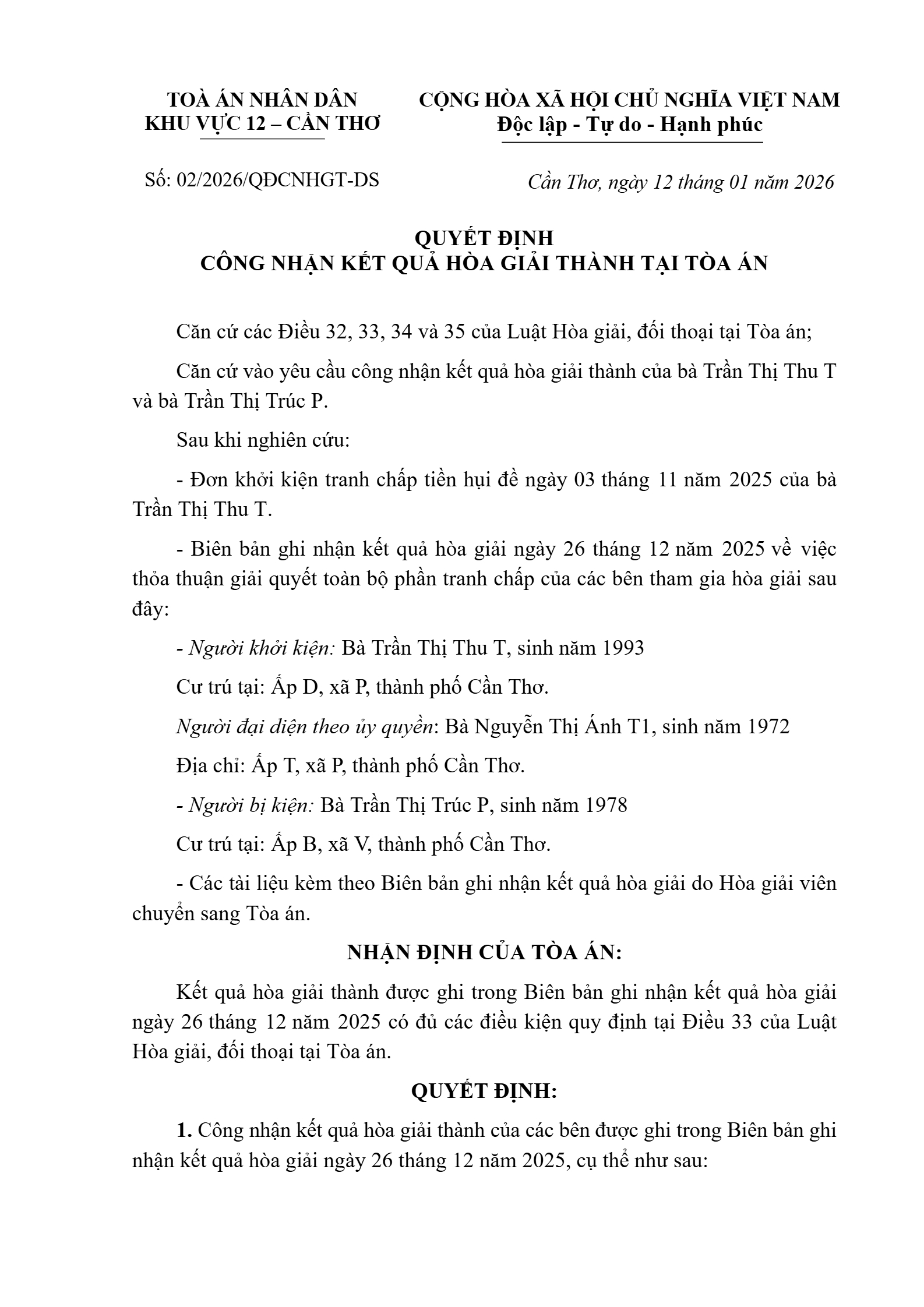 | Tòa án xét xử: | Tòa án nhân dân khu vực 12 - Cần Thơ, TP. Cần Thơ |