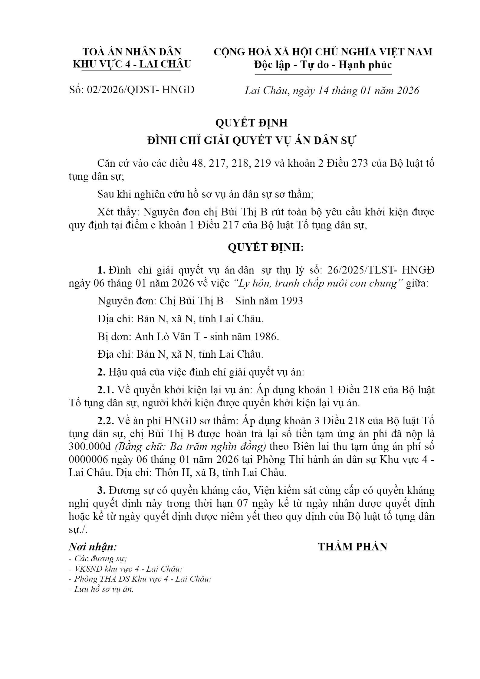 Quyết định số 02/2026/QĐST- ngày 14/01/2026 của Tòa án nhân dân khu vực 4 - Lai Châu, tỉnh Lai Châu về vụ án ly hôn về mâu thuẫn gia đình
