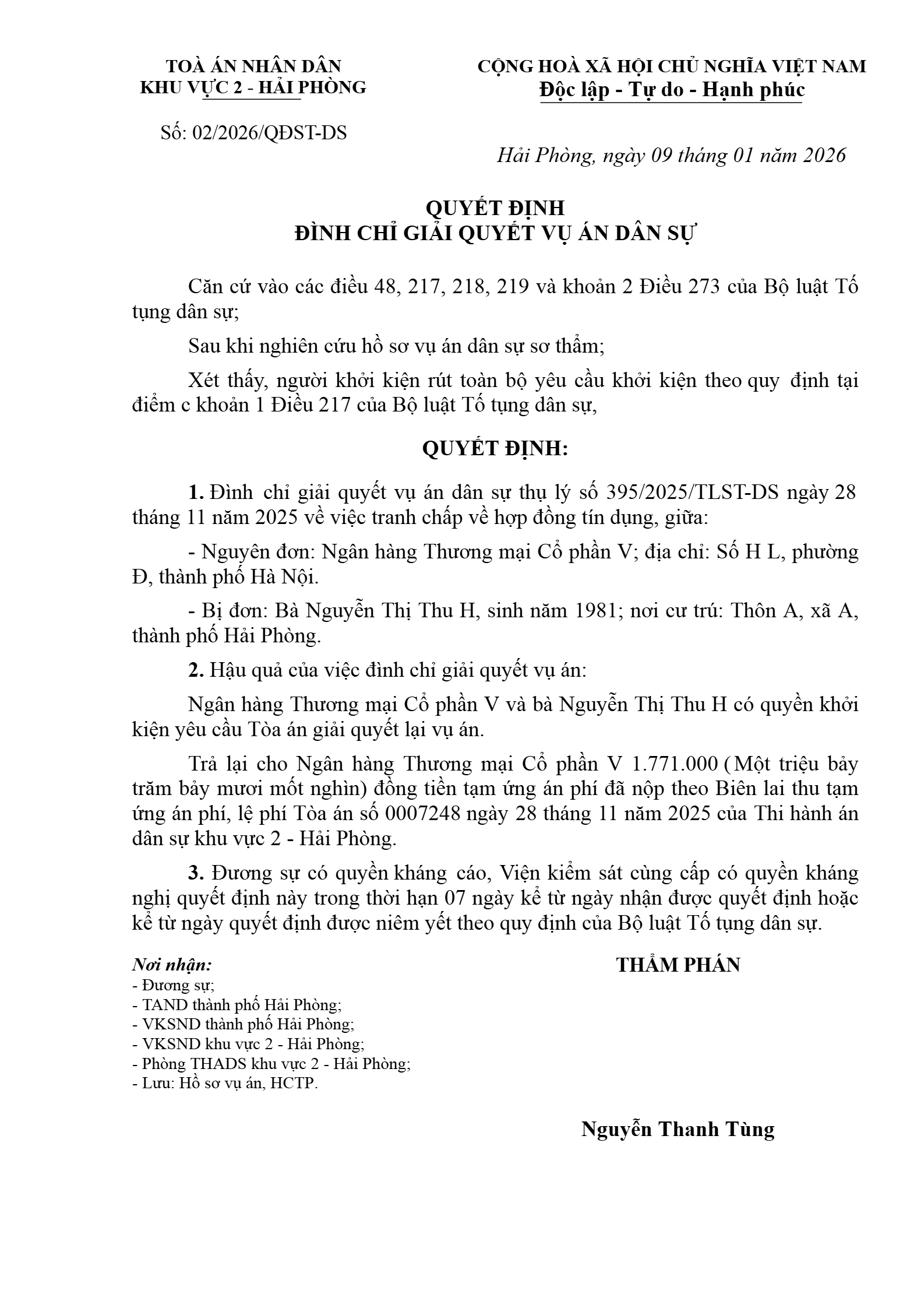 Quyết định số 02/2026/QĐST-DS ngày 09/01/2026 của Tòa án nhân dân khu vực 2 - Hải Phòng, TP. Hải Phòng về tranh chấp hợp đồng tín dụng