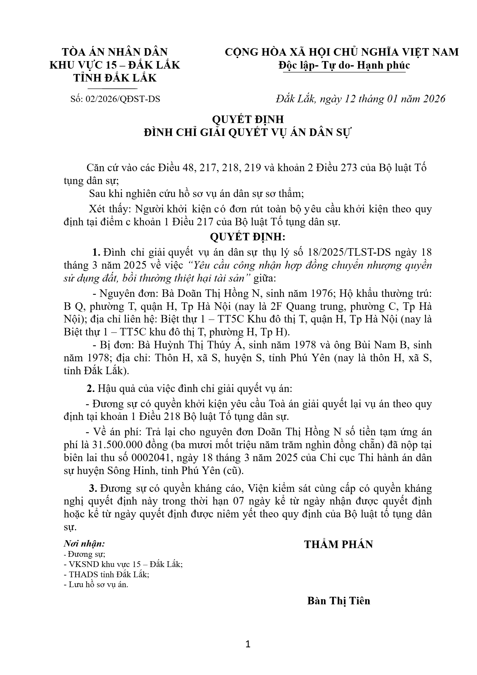 Quyết định số 02/2026/QĐST-DS ngày 12/01/2026 của Tòa án nhân dân khu vực 15 - Đắk Lắk, tỉnh Đắk Lắk về tranh chấp hợp đồng chuyển nhượng quyền sử dụng đất