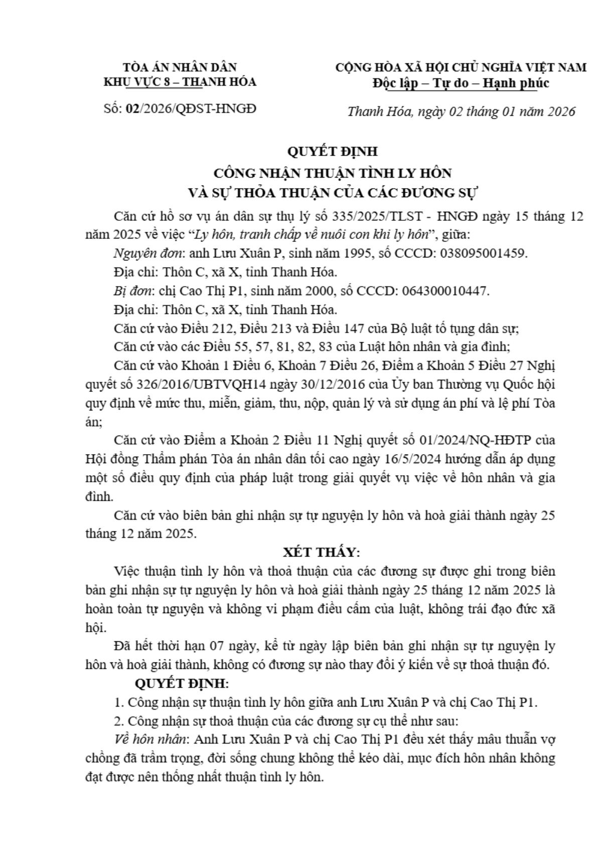 Quyết định số 02/2026/QĐST-HNGĐ ngày 02/01/2026 của Tòa án nhân dân khu vực 8 - Thanh Hóa, tỉnh Thanh Hóa về vụ án ly hôn về mâu thuẫn gia đình