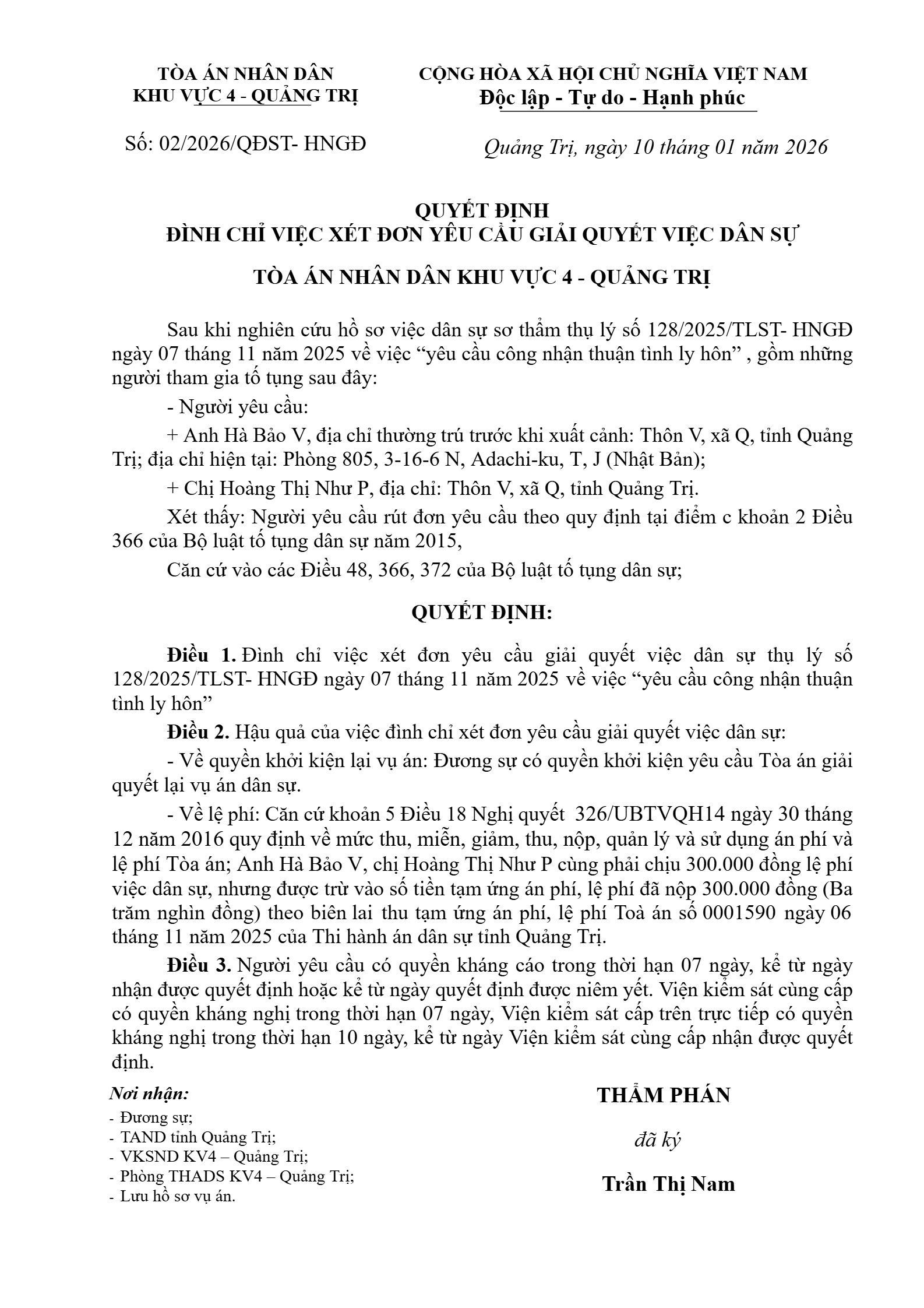 Quyết định số 02/2026/QĐST-HNGĐ ngày 10/01/2026 của Tòa án nhân dân khu vực 4 - Quảng Trị, tỉnh Quảng Trị về vụ án ly hôn về mâu thuẫn gia đình