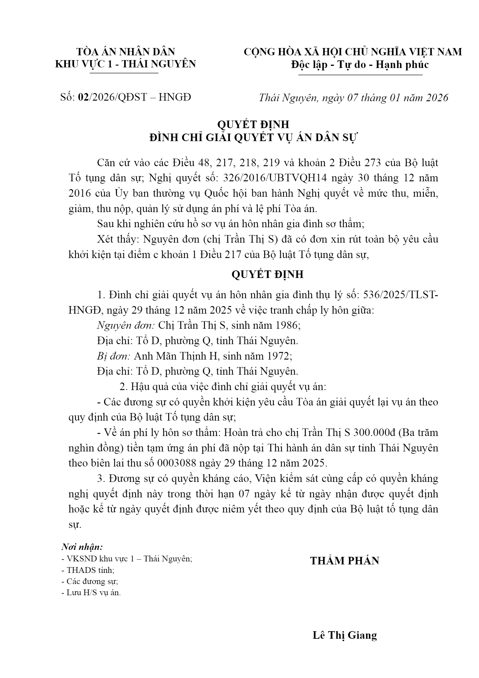 Quyết định số 02/2026/QĐST-HNGĐ ngày 07/01/2026 của Tòa án nhân dân khu vực 1 - Thái Nguyên, tỉnh Thái Nguyên về vụ án ly hôn về mâu thuẫn gia đình