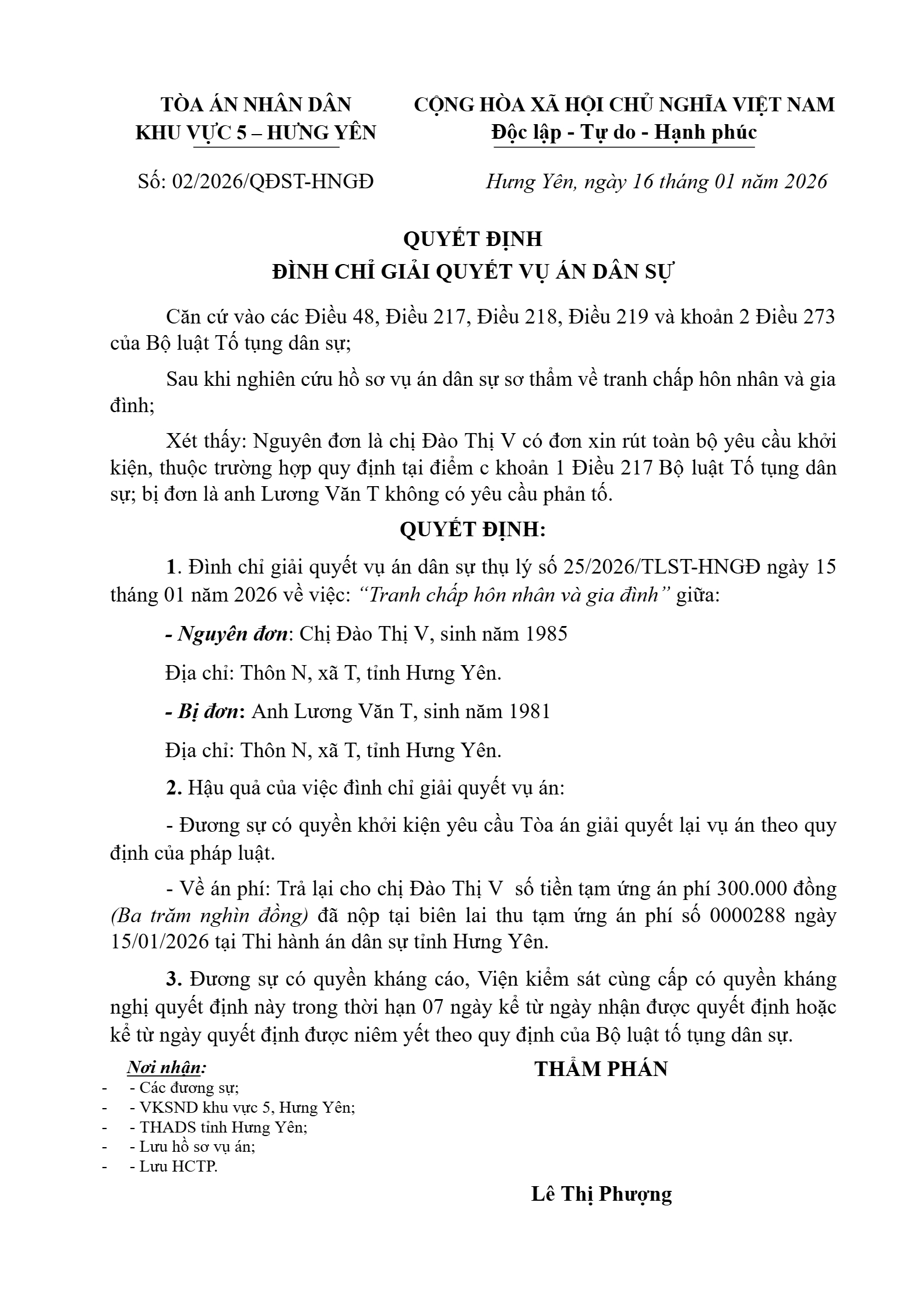 Quyết định số 02/2026/QĐST-HNGĐ ngày 16/01/2026 của Tòa án nhân dân khu vực 5 - Hưng Yên, tỉnh Hưng Yên về vụ án ly hôn về mâu thuẫn gia đình