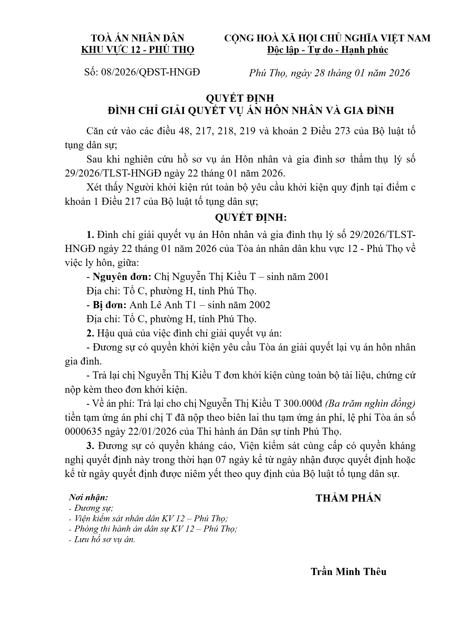 Quyết định số 02/2026/QĐST-HNGĐ ngày 28/01/2026 của Tòa án nhân dân khu vực 12 - Phú Thọ, tỉnh Phú Thọ về vụ án ly hôn về mâu thuẫn gia đình
