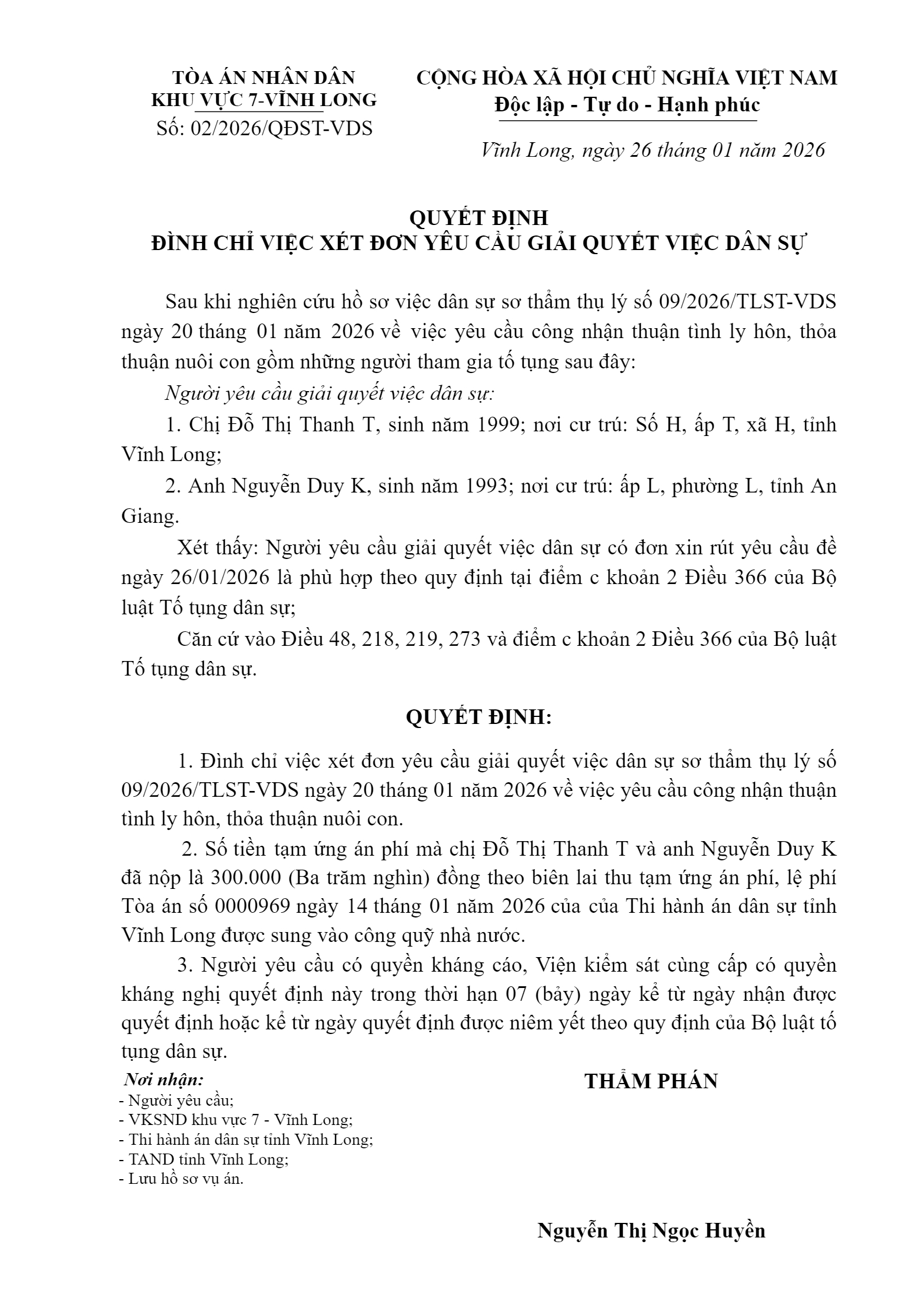 | Tên Quyết định: | Quyết định số 02/2026/QĐST-HNGĐ ngày 26/01/2026 của Tòa án nhân dân khu vực 7 - Vĩnh Long, tỉnh Vĩnh Long về yêu cầu công nhận thuận tình ly hôn |