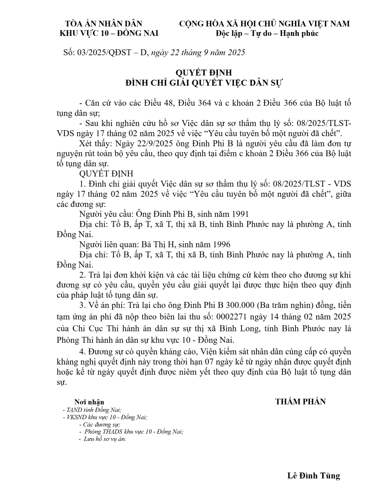 Quyết định số 03/2025/QĐST-DS ngày 22/09/2025 của Tòa án nhân dân khu vực 10 - Đồng Nai, tỉnh Đồng Nai về y/c tuyên bố hoặc hủy bỏ quyết định tuyên bố một người đã chết