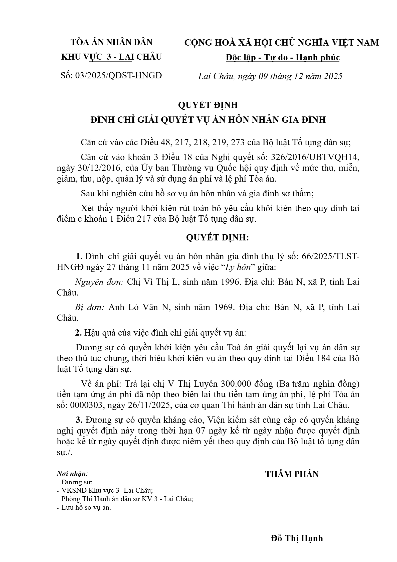Quyết định số 03/2025/QĐST-HNGĐ ngày 09/12/2025 của Tòa án nhân dân khu vực 3 - Lai Châu, tỉnh Lai Châu về vụ án ly hôn về mâu thuẫn gia đình