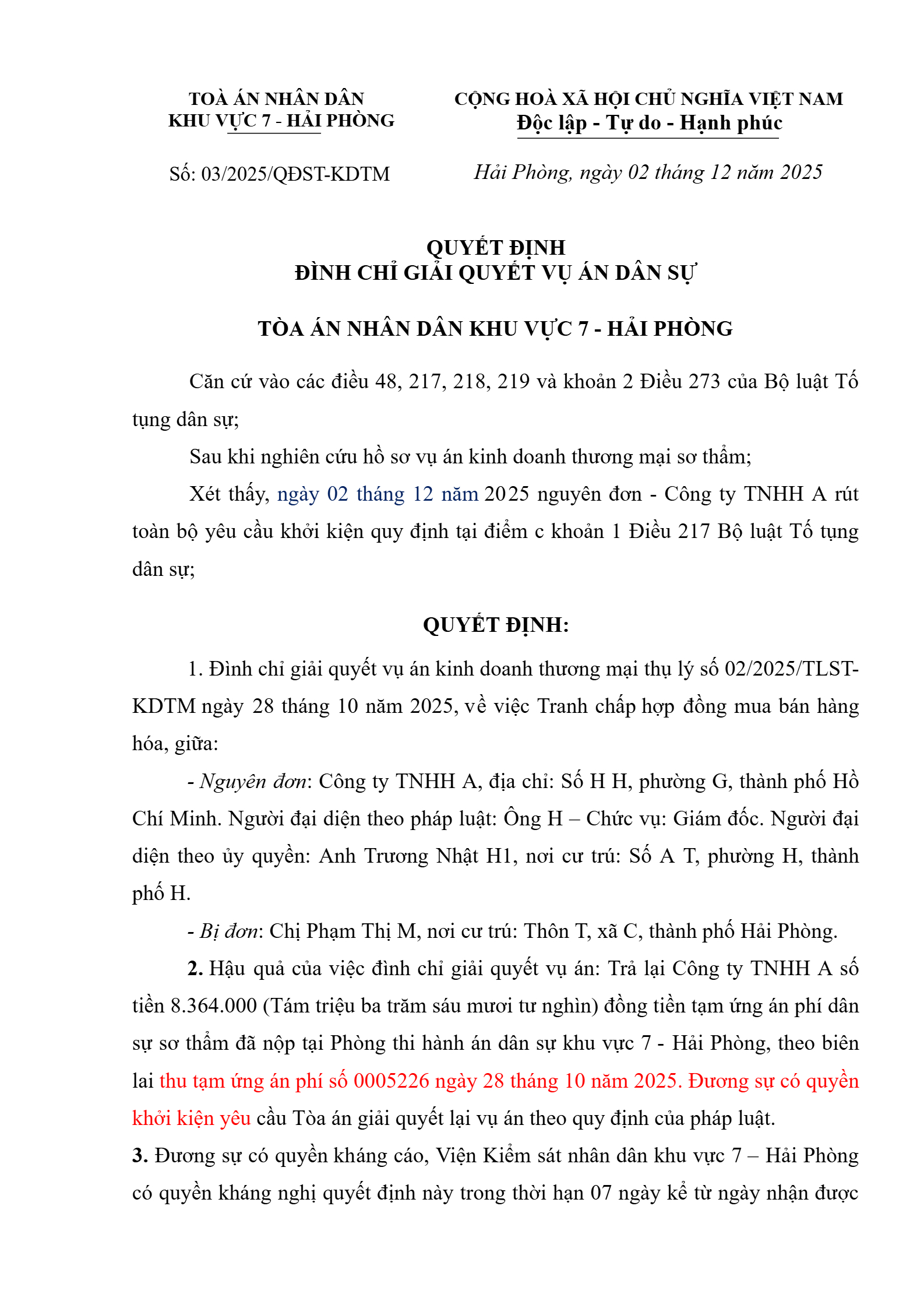Quyết định số 03/2025/QĐST-KDTM ngày 03/12/2025 của Tòa án nhân dân khu vực 7 - Hải Phòng, TP. Hải Phòng về tranh chấp về mua bán hàng hóa
