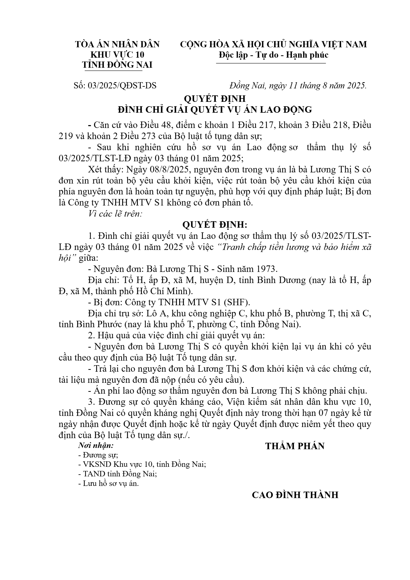 Quyết định số 03/2025/QĐST-LĐ ngày 11/08/2025 của Tòa án nhân dân khu vực 10 - Đồng Nai, tỉnh Đồng Nai về tranh chấp về bồi thường thiệt hại, trợ cấp khi chấm dứt hợp đồng lao động