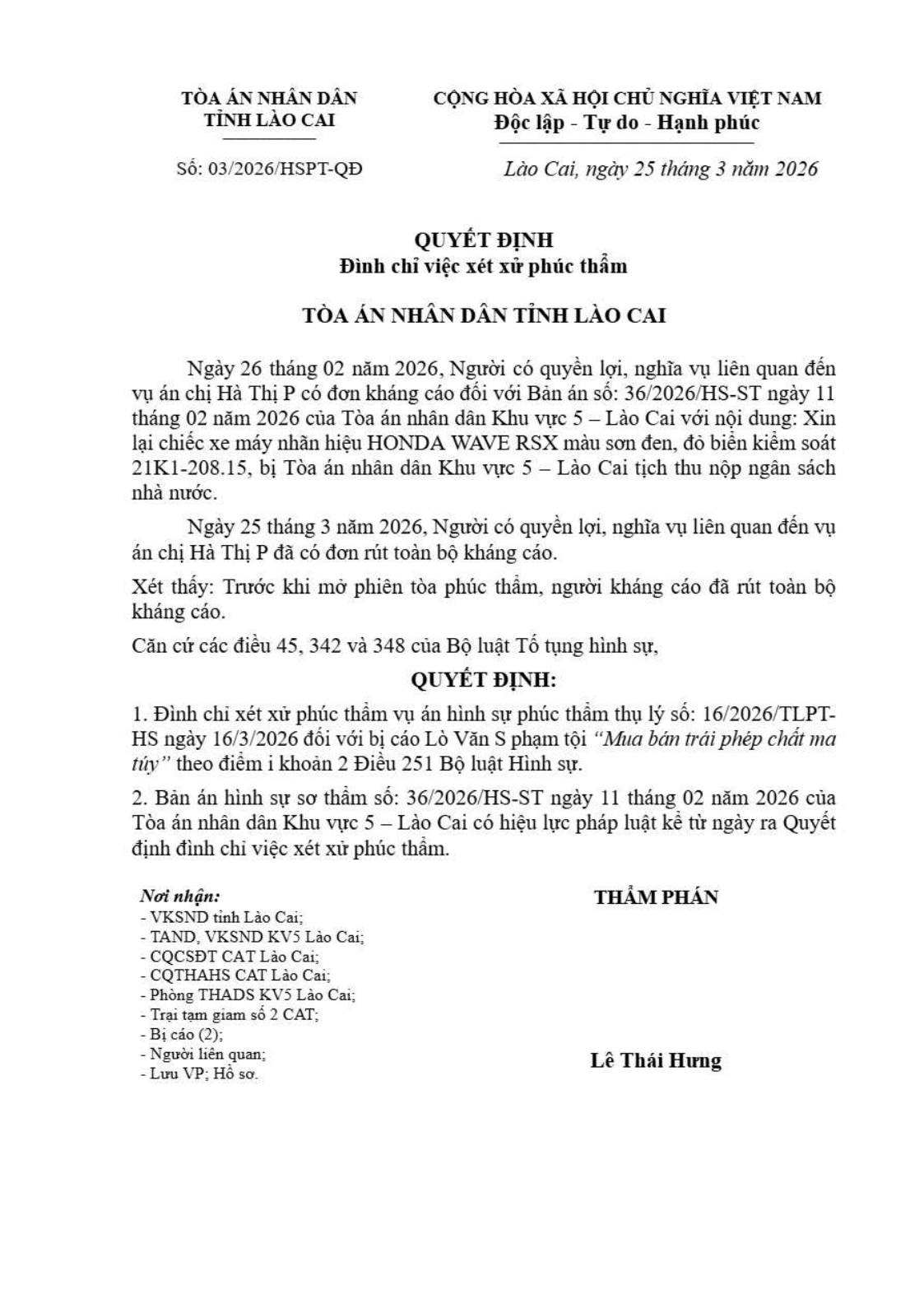 Quyết định số 03/2026/QĐPT-HS ngày 25/03/2026 của TAND tỉnh Lào Cai