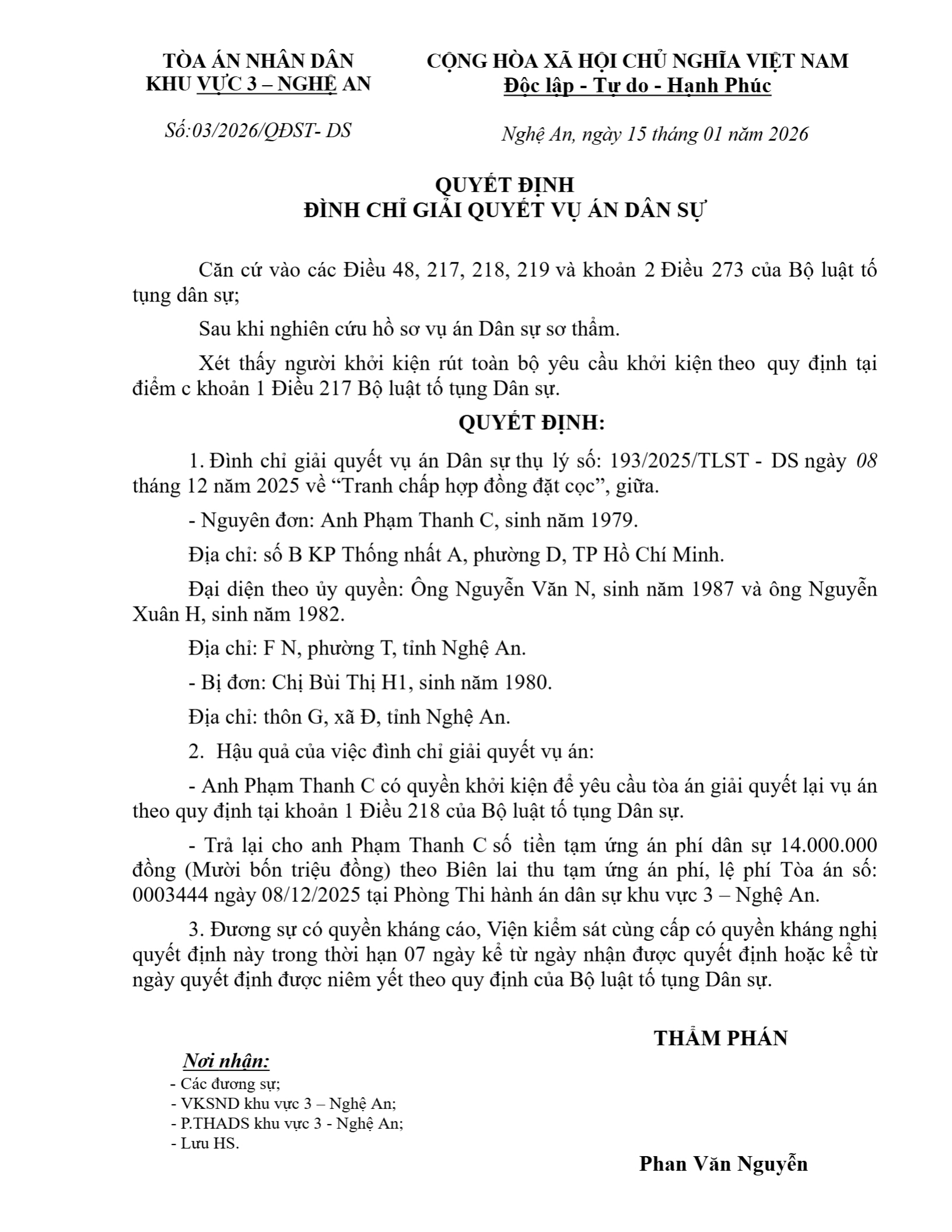 Quyết định số 03/2026/QĐST- ngày 15/01/2026 của Tòa án nhân dân khu vực 3 - Nghệ An, tỉnh Nghệ An về tranh chấp hợp đồng đặt cọc