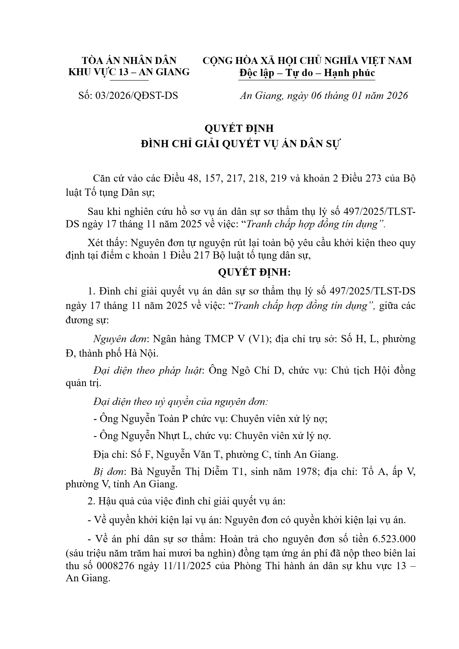 Quyết định số 03/2026/QĐST-DS ngày 06/01/2026 của Tòa án nhân dân khu vực 13 - An Giang, tỉnh An Giang về tranh chấp hợp đồng vay tài sản