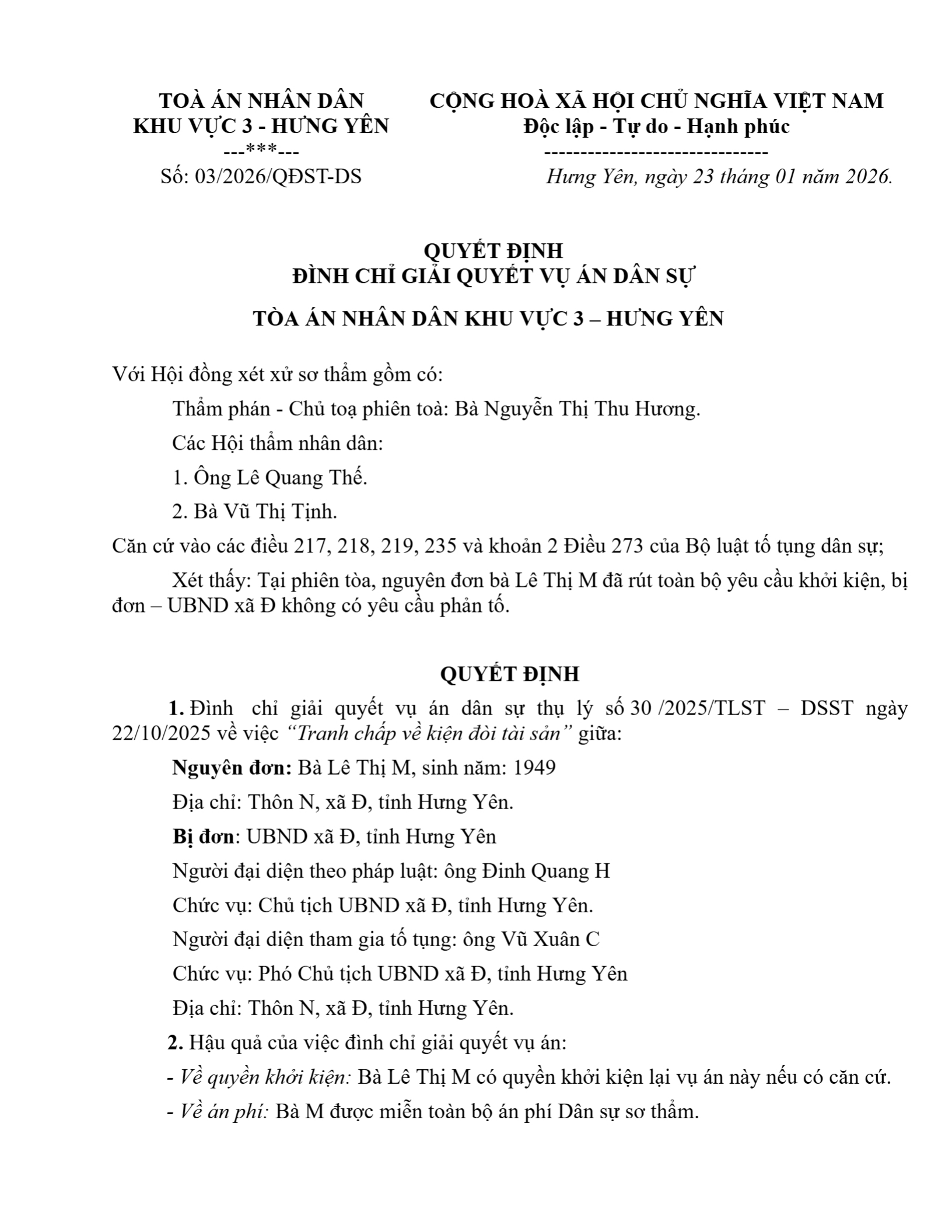 | Tên Quyết định: | Quyết định số 03/2026/QĐST-DS ngày 23/01/2026 của Tòa án nhân dân khu vực 3 - Hưng Yên, tỉnh Hưng Yên về đòi bồi thường thiệt hại ngoài hợp đồng về tài sản |