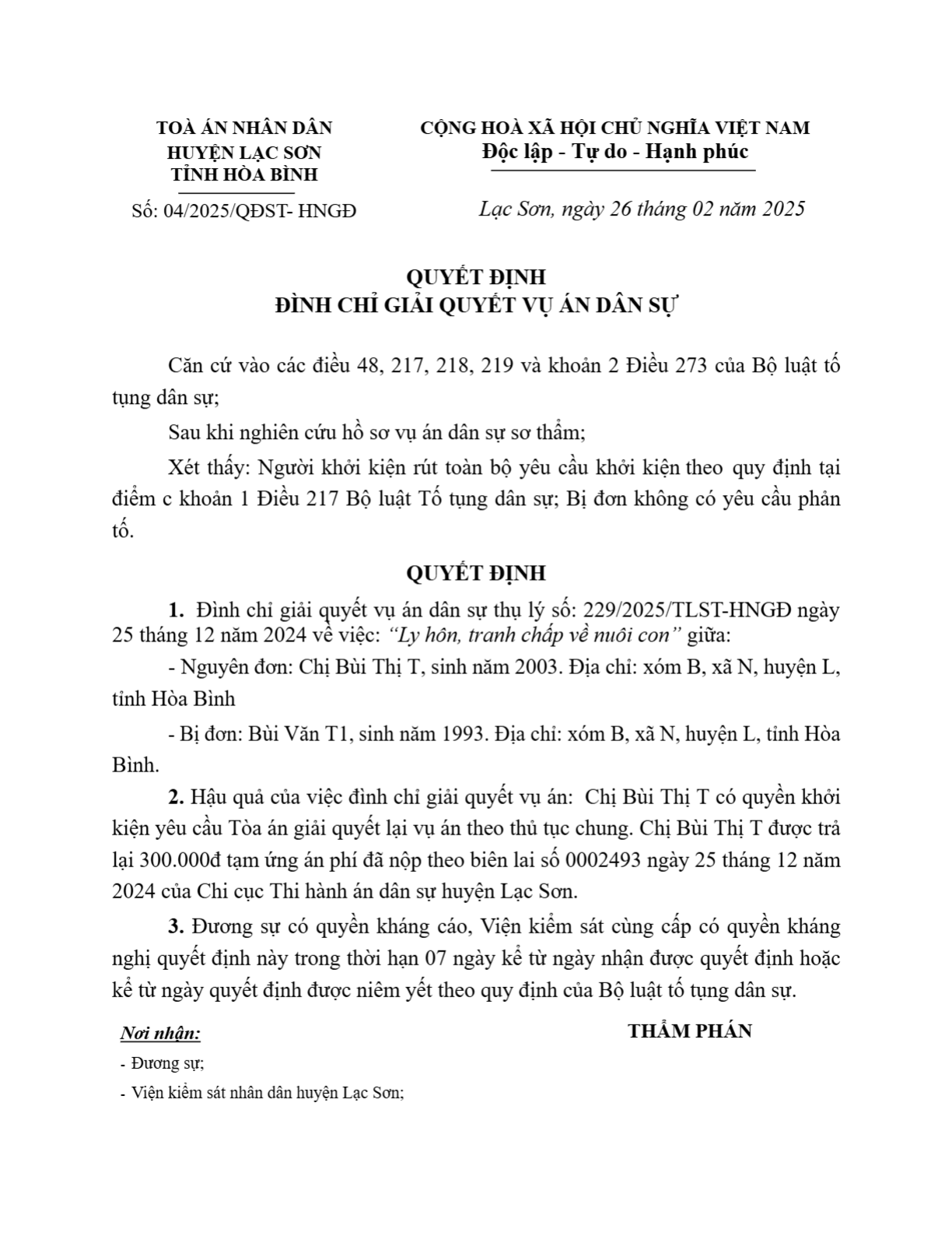 Quyết định số 04/2025/QĐST- ngày 09/06/2025 của TAND huyện Lạc Sơn, tỉnh Hòa Bình về vụ án ly hôn về mâu thuẫn gia đình