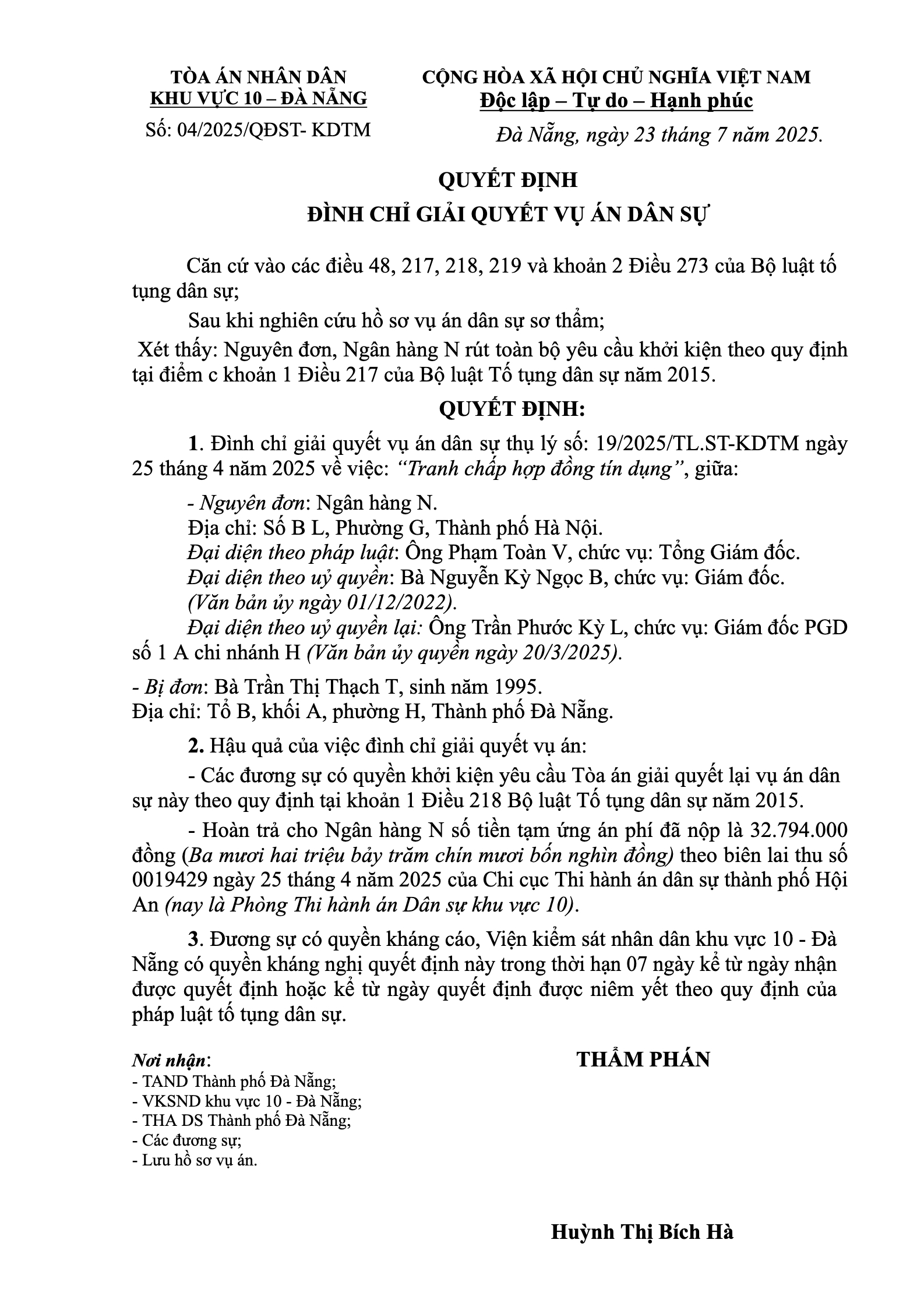 Quyết định số 04/2025/QĐST- ngày 23/07/2025 của Tòa án nhân dân khu vực 10 - Đà Nẵng, TP Đà Nẵng về tranh chấp hợp đồng tín dụng